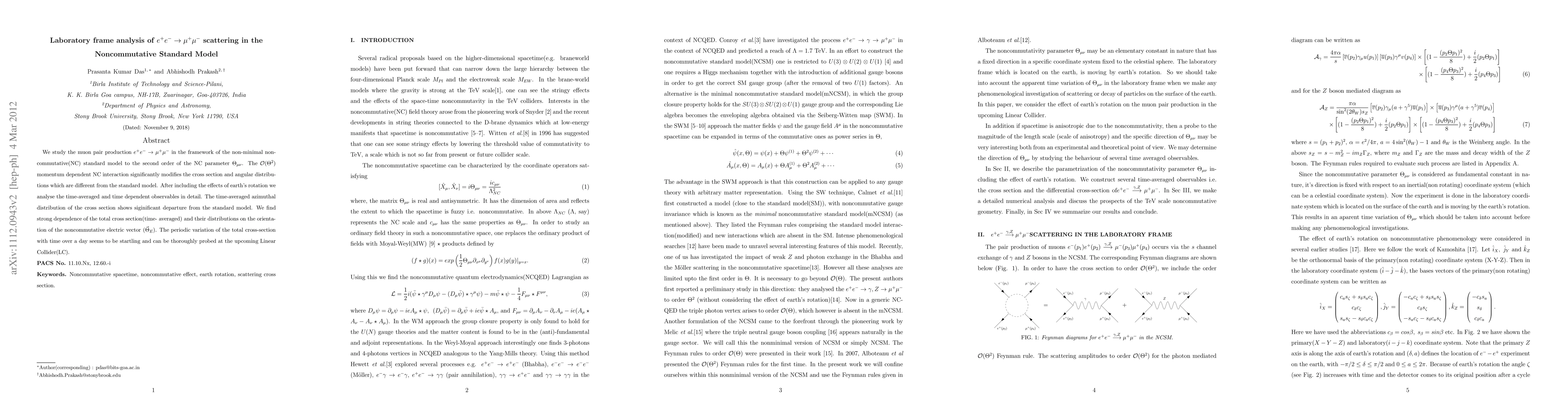 We study the muon pair production $ e^+ e^- \to \mu^+ \mu^-$ in the framework of the non-minimal noncommutative(NC) standard model to the second order of the NC parameter $\Theta_{\mu\nu}$. The $\mathcal{O}(\Theta^2)$ momentum dependent NC interaction significantly modifies the cross section and angular distributions which are different from the standard model. After including the effects of earth's rotation we analyse the time-averaged and time dependent observables in detail. The time-averaged azimuthal distribution of the cross section shows siginificant departure from the standard model. We find strong dependence of the total cross section(time- averaged) and their distributions on the orientation of the noncommutative electric vector (${\vec{\Theta}}_E$). The periodic variation of the total cross-section with time over a day seems to be startling and can be thoroughly probed at the upcoming Linear Collider(LC).