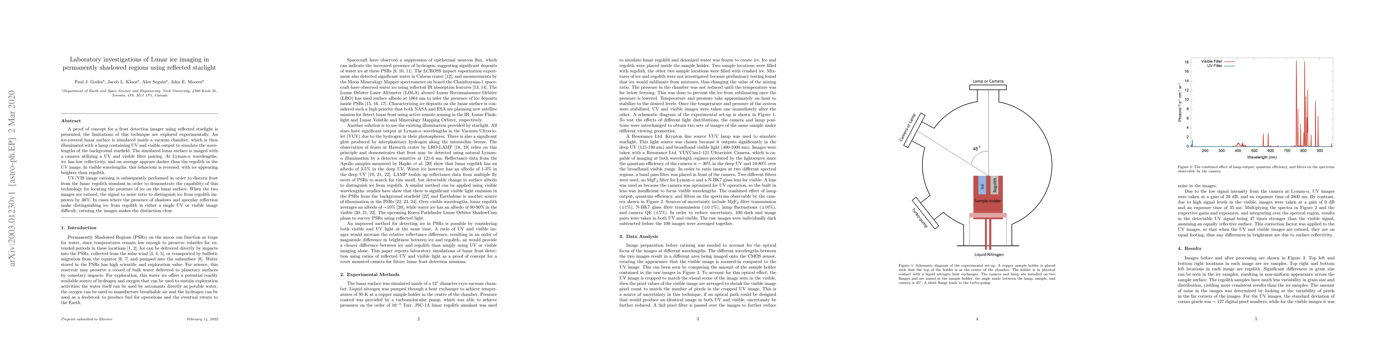 A proof of concept for a frost detection imager using reflected starlight is presented; the limitations of this technique are explored experimentally. An ice-covered lunar surface is simulated inside a vacuum chamber, which is then illuminated with a lamp containing UV and visible output to simulate the wavelengths of the background starfield. The simulated lunar surface is imaged with a camera utilizing a UV and visible filter pairing. At Lyman-alpha wavelengths, ice has low reflectivity, and on average appears darker than the regolith in the UV image. In visible wavelengths, this behaviour is reversed, with ice appearing brighter than regolith. UV/VIS image ratioing is subsequently performed in order to discern frost from the lunar regolith simulant in order to demonstrate the capability of this technology for locating the presence of ice on the lunar surface. When the two images are ratioed, the signal to noise ratio to distinguish ice from regolith improves by 36%. In cases where the presence of shadows and specular reflection make distinguishing ice from regolith in either a single UV or visible image difficult, ratioing the images makes the distinction clear.