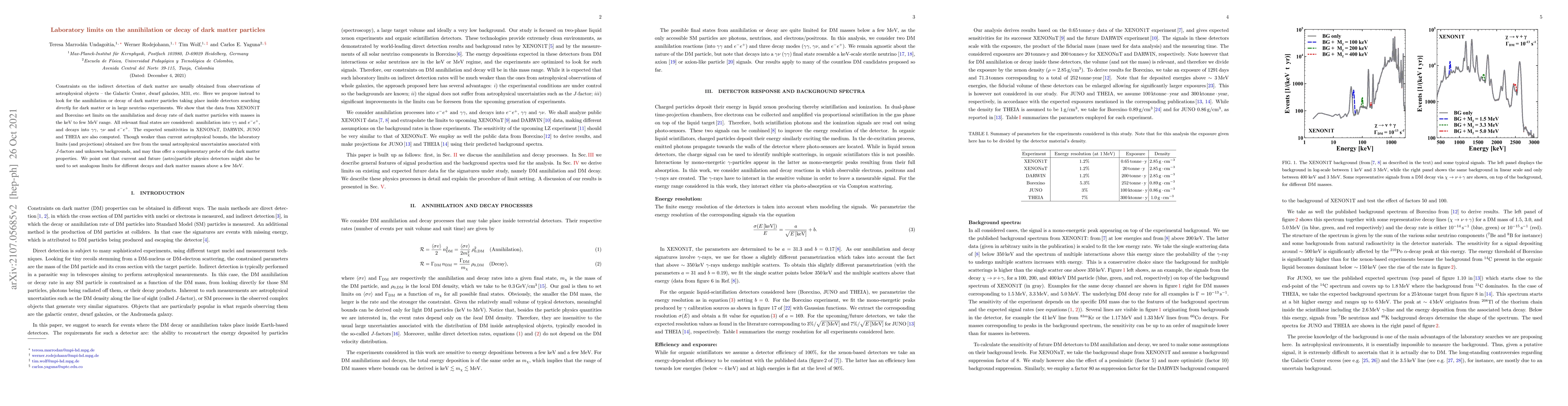 Constraints on the indirect detection of dark matter are usually obtained from observations of astrophysical objects -- the Galactic Center, dwarf galaxies, M31, etc. Here we propose instead to look for the annihilation or decay of dark matter particles taking place inside detectors searching \emph{directly} for dark matter or in large neutrino experiments. We show that the data from XENON1T and Borexino set limits on the annihilation and decay rate of dark matter particles with masses in the keV to few MeV range. All relevant final states are considered: annihilation into $\gamma\gamma$ and $e^-e^+$, and decays into $\gamma\gamma$, $\gamma\nu$ and $e^-e^+$. The expected sensitivities in XENONnT, DARWIN, JUNO and THEIA are also computed. Though weaker than current astrophysical bounds, the laboratory limits (and projections) obtained are free from the usual astrophysical uncertainties associated with $J$-factors and unknown backgrounds, and may thus offer a complementary probe of the dark matter properties. We point out that current and future (astro)particle physics detectors might also be used to set analogous limits for different decays and dark matter masses above a few MeV.
