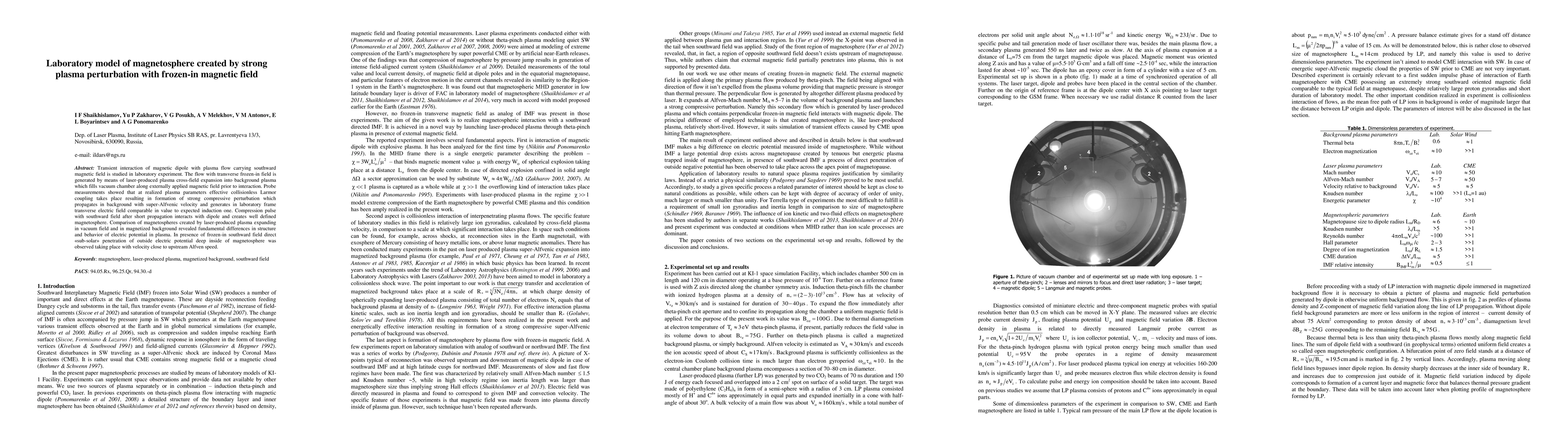 Transient interaction of magnetic dipole with plasma flow carrying southward magnetic field is studied in laboratory experiment. The flow with transverse frozen-in field is generated by means of laser-produced plasma cross-field expansion into background plasma which fills vacuum chamber along externally applied magnetic field prior to interaction. Probe measurements showed that at realized plasma parameters effective collisionless Larmor coupling takes place resulting in formation of strong compressive perturbation which propagates in background with super-Alfvenic velocity and generates in laboratory frame transverse electric field comparable in value to expected induction one. Compression pulse with southward field after short propagation interacts with dipole and creates well defined magnetosphere. Comparison of magnetospheres created by laser-produced plasma expanding in vacuum field and in magnetized background revealed fundamental differences in structure and behavior of electric potential in plasma. In presence of frozen-in southward field direct {\guillemotleft}sub-solar{\guillemotright} penetration of outside electric potential deep inside of magnetosphere was observed taking place with velocity close to upstream Alfven speed.