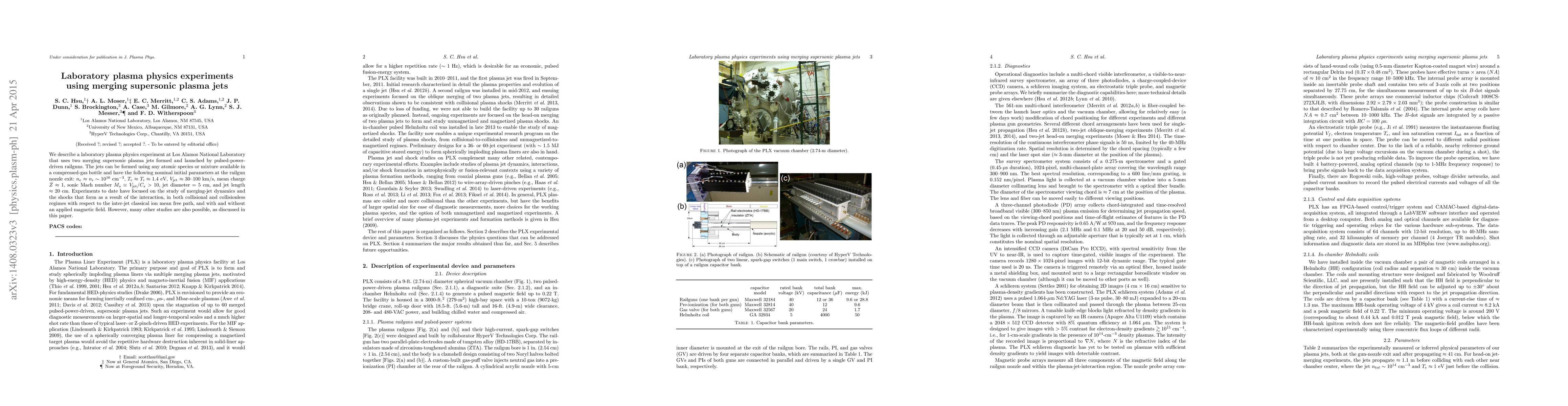 This paper details an experimental setup at Los Alamos National Laboratory using merging supersonic plasma jets from rail guns, focusing on the dynamics of merging jets and resulting shock waves, in both collisional and collisionless regimes. The study explores various plasma parameters and interactions under different magnetic field conditions.