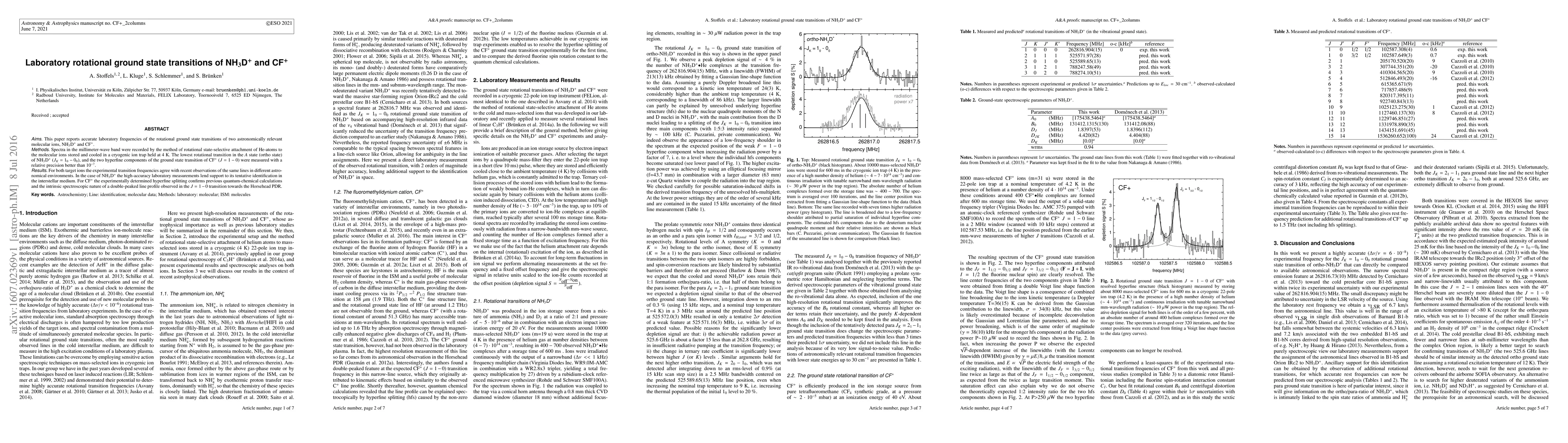 Aims. This paper reports accurate laboratory frequencies of the rotational ground state transitions of two astronomically relevant molecular ions, NH3D+ and CF+. Methods. Spectra in the millimeter-wave band were recorded by the method of rotational state-selective attachment of He-atoms to the molecular ions stored and cooled in a cryogenic ion trap held at 4 K. The lowest rotational transition in the A state (ortho state) of NH$_3$D$^+$ ($J_K = 1_0 - 0_0$), and the two hyperfine components of the ground state transition of CF$^+$($J = 1 - 0$) were measured with a relative precision better than $10^{-7}$. Results. For both target ions the experimental transition frequencies agree with recent observations of the same lines in different astronomical environments. In the case of NH$_3$D$^+$ the high-accuracy laboratory measurements lend support to its tentative identification in the interstellar medium. For CF$^+$ the experimentally determined hyperfine splitting confirms previous quantum-chemical calculations and the intrinsic spectroscopic nature of a double-peaked line profile observed in the $J = 1 - 0$ transition towards the Horsehead PDR.