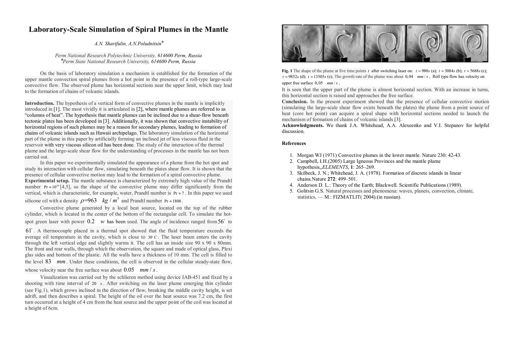 On the basis of laboratory simulation a mechanism is established for the formation of the upper mantle convection spiral plumes from a hot point in the presence of a roll-type large-scale convective flow. The observed plume has horizontal sections near the upper limit, which may lead to the formation of chains of volcanic islands.