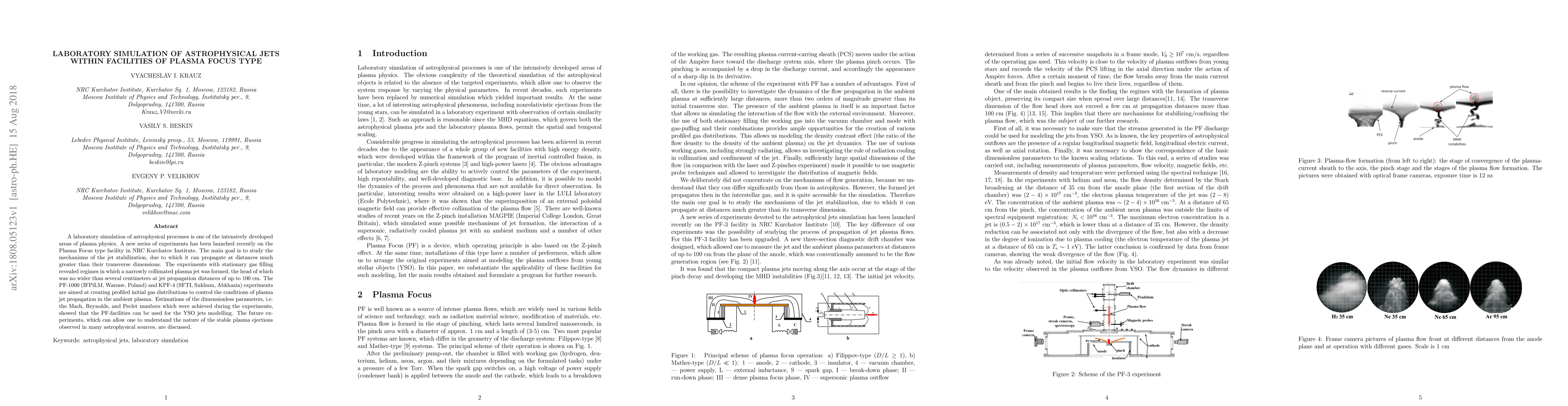 A laboratory simulation of astrophysical processes is one of the intensively developed areas of plasma physics. A new series of experiments has been launched recently on the Plasma Focus type facility in NRC Kurchatov Institute. The main goal is to study the mechanisms of the jet stabilization, due to which it can propagate at distances much greater than their transverse dimensions. The experiments with stationary gas filling revealed regimes in which a narrowly collimated plasma jet was formed, the head of which was no wider than several centimeters at jet propagation distances of up to 100 cm. The PF-1000 (IFPiLM, Warsaw, Poland) and KPF-4 (SFTI, Sukhum, Abkhazia) experiments are aimed at creating profiled initial gas distributions to control the conditions of plasma jet propagation in the ambient plasma. Estimations of the dimensionless parameters, i.e. the Mach, Reynolds, and Peclet numbers which were achieved during the experiments, showed that the PF-facilities can be used for the YSO jets modelling. The future experiments, which can allow one to understand the nature of the stable plasma ejections observed in many astrophysical sources, are discussed.
