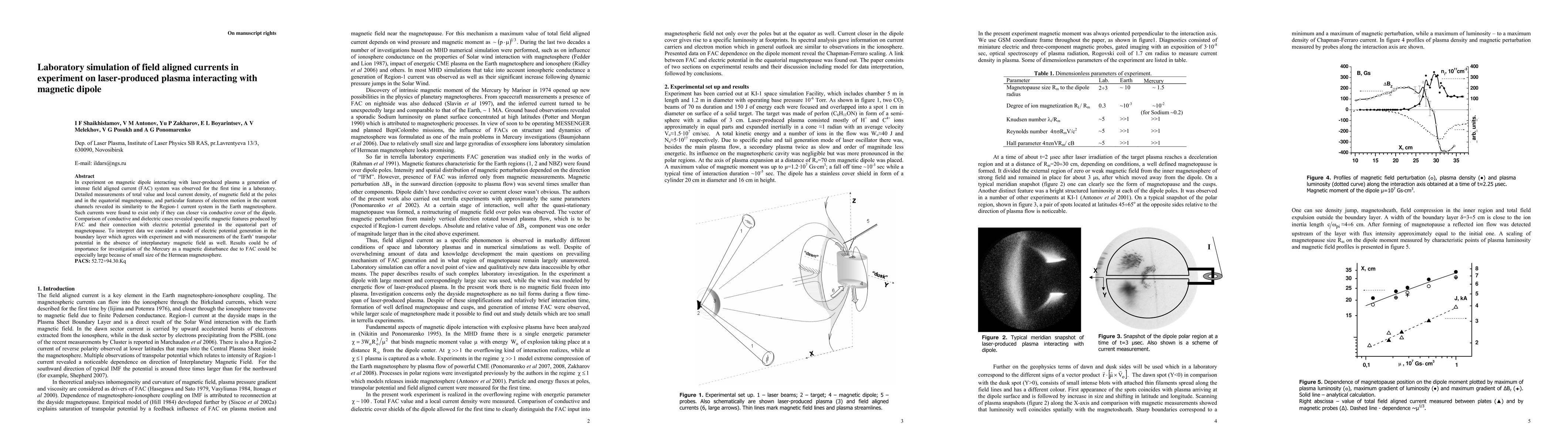 This study simulates field aligned currents in a laser-produced plasma interacting with a magnetic dipole, observing intense currents similar to Earth's Region-1 system. The experiment reveals magnetic features and electric potential generation in the equatorial magnetopause, with implications for understanding magnetic disturbances on Mercury.