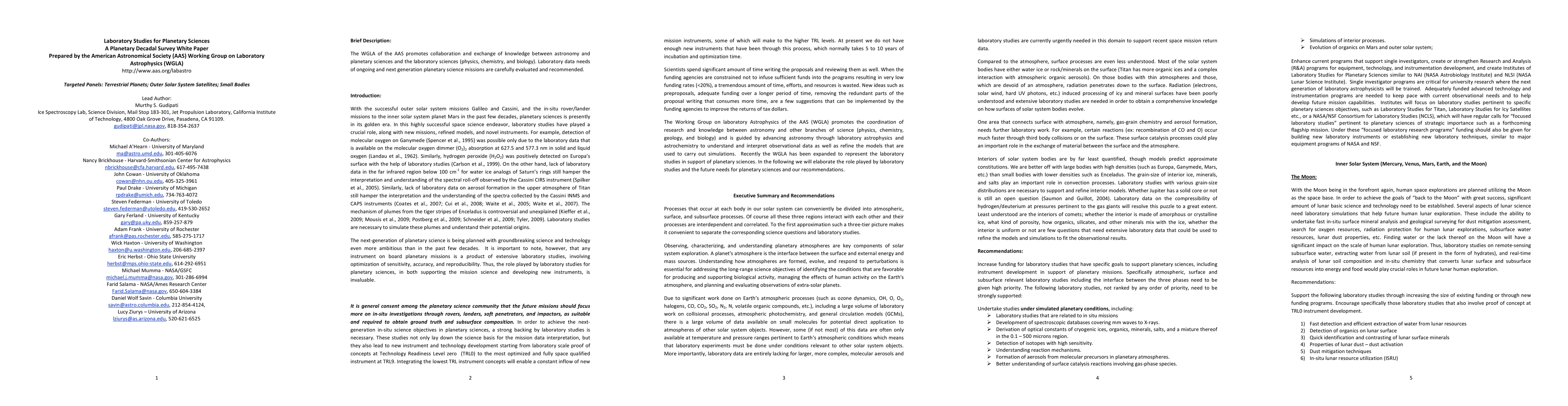 The American Astronomical Society's Working Group on Laboratory Astrophysics (WGLA) emphasizes the importance of laboratory sciences in supporting planetary science missions, advocating for collaborative efforts and knowledge exchange to meet the data needs of current and future missions. This white paper submitted to the Planetary Decadal Survey outlines recommendations for enhancing laboratory astrophysics research.