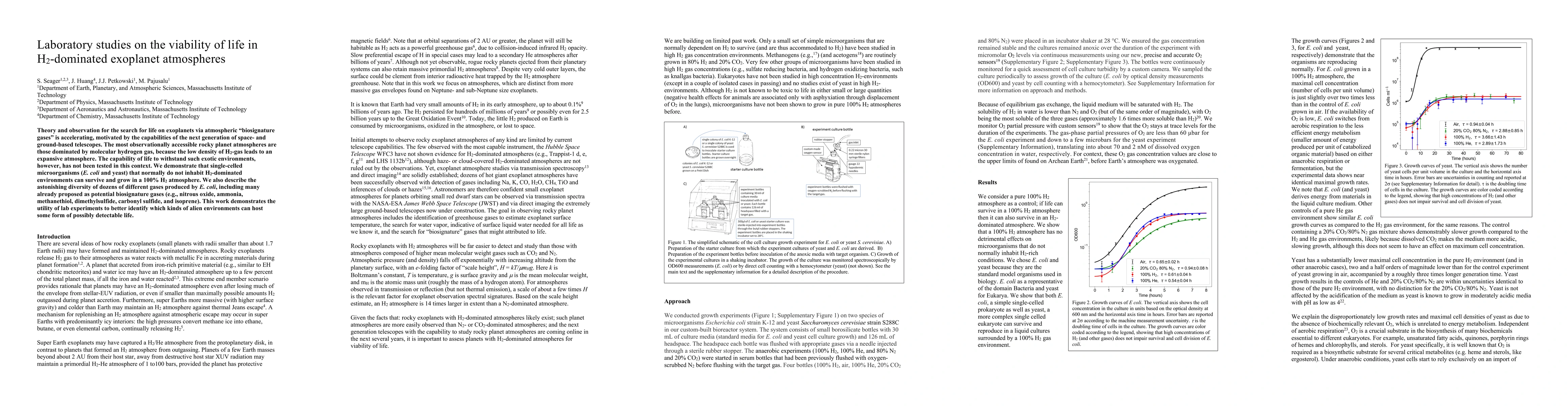 Theory and observation for the search for life on exoplanets via atmospheric "biosignature gases" is accelerating, motivated by the capabilities of the next generation of space- and ground-based telescopes. The most observationally accessible rocky planet atmospheres are those dominated by molecular hydrogen gas, because the low density of H$_2$-gas leads to an expansive atmosphere. The capability of life to withstand such exotic environments, however, has not been tested in this context. We demonstrate that single-celled microorganisms ($\textit{E. coli}$ and yeast) that normally do not inhabit H$_2$-dominated environments can survive and grow in a 100% H$_2$ atmosphere. We also describe the astonishing diversity of dozens of different gases produced by $\textit{E. coli}$, including many already proposed as potential biosignature gases (e.g., nitrous oxide, ammonia, methanethiol, dimethylsulfide, carbonyl sulfide, and isoprene). This work demonstrates the utility of lab experiments to better identify which kinds of alien environments can host some form of possibly detectable life.