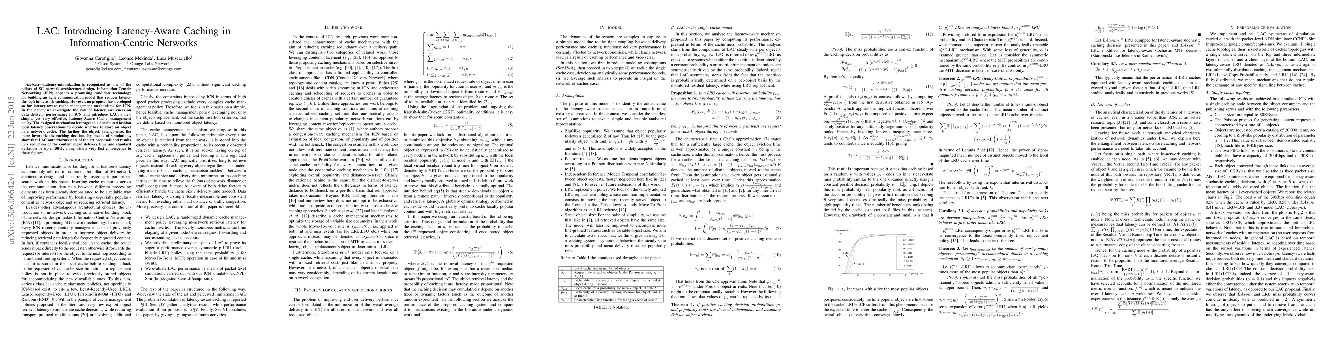 This paper introduces LAC, a Latency-Aware Cache management policy for Information-Centric Networking, which uses local latency observations to optimize caching decisions, significantly reducing content delivery time and improving performance. Simulation results show LAC outperforms existing methods, achieving a 50% reduction in mean delivery time and standard deviation.