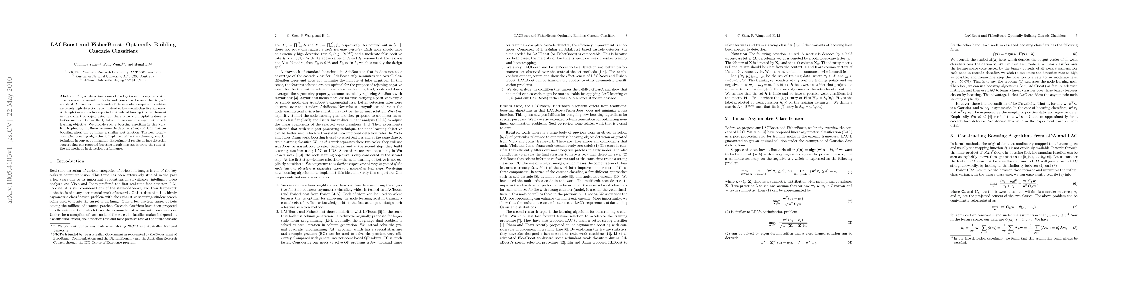 Object detection is one of the key tasks in computer vision. The cascade framework of Viola and Jones has become the de facto standard. A classifier in each node of the cascade is required to achieve extremely high detection rates, instead of low overall classification error. Although there are a few reported methods addressing this requirement in the context of object detection, there is no a principled feature selection method that explicitly takes into account this asymmetric node learning objective. We provide such a boosting algorithm in this work. It is inspired by the linear asymmetric classifier (LAC) of Wu et al. in that our boosting algorithm optimizes a similar cost function. The new totally-corrective boosting algorithm is implemented by the column generation technique in convex optimization. Experimental results on face detection suggest that our proposed boosting algorithms can improve the state-of-the-art methods in detection performance.