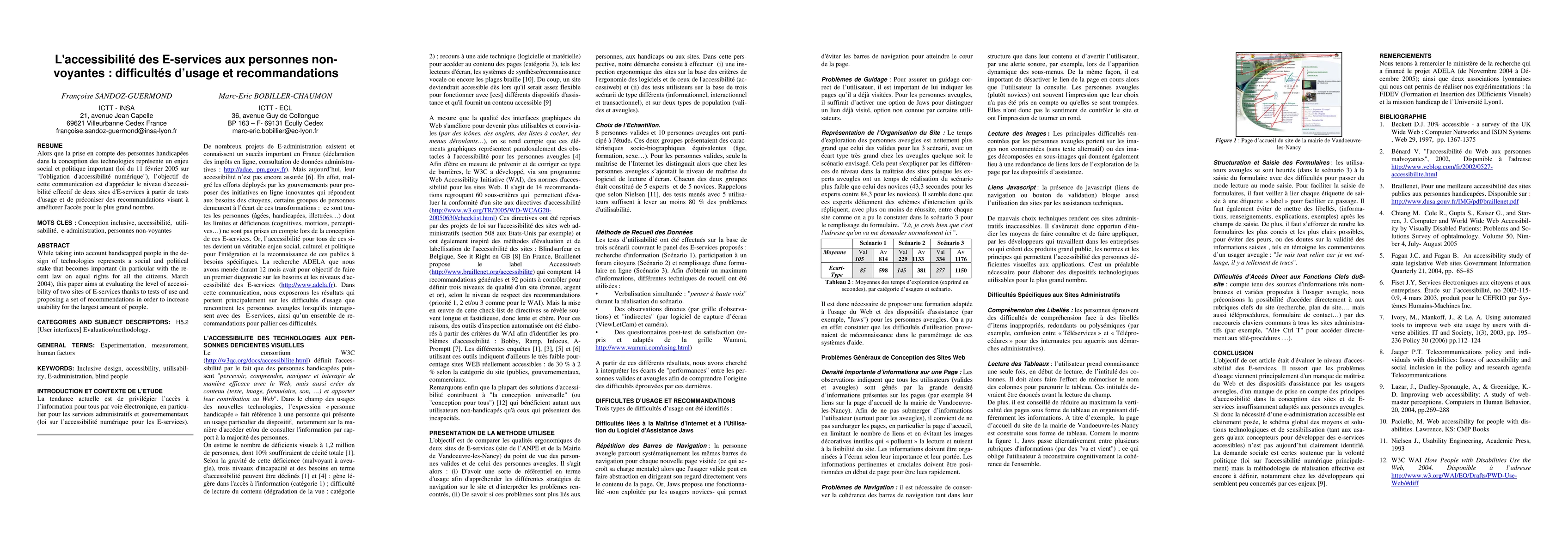 While taking into account handicapped people in the design of technologies represents a social and political stake that becomes important (in particular with the recent law on equal rights for all the citizens, March 2004), this paper aims at evaluating the level of accessibility of two sites of E-services thanks to tests of use and proposing a set of recommendations in order to increase usability for the largest amount of people.