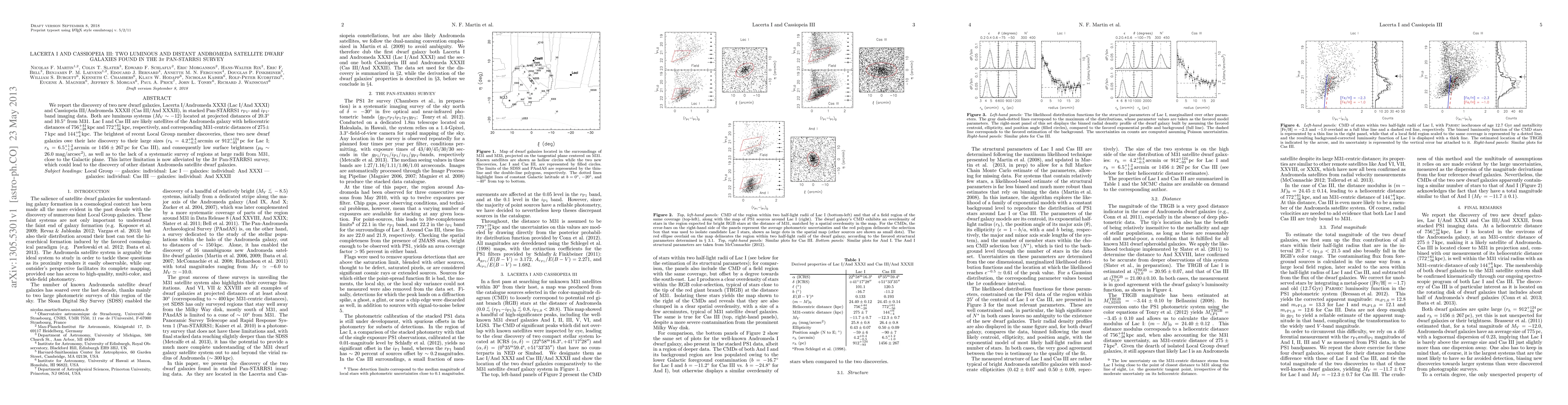 The paper reports the discovery of two luminous, distant dwarf galaxies, Lacerta I and Cassiopeia III, as satellites of the Andromeda galaxy, found in Pan-STARRS1 survey data. These galaxies, with large sizes and low surface brightness, were previously undetected due to their location near the Galactic plane.