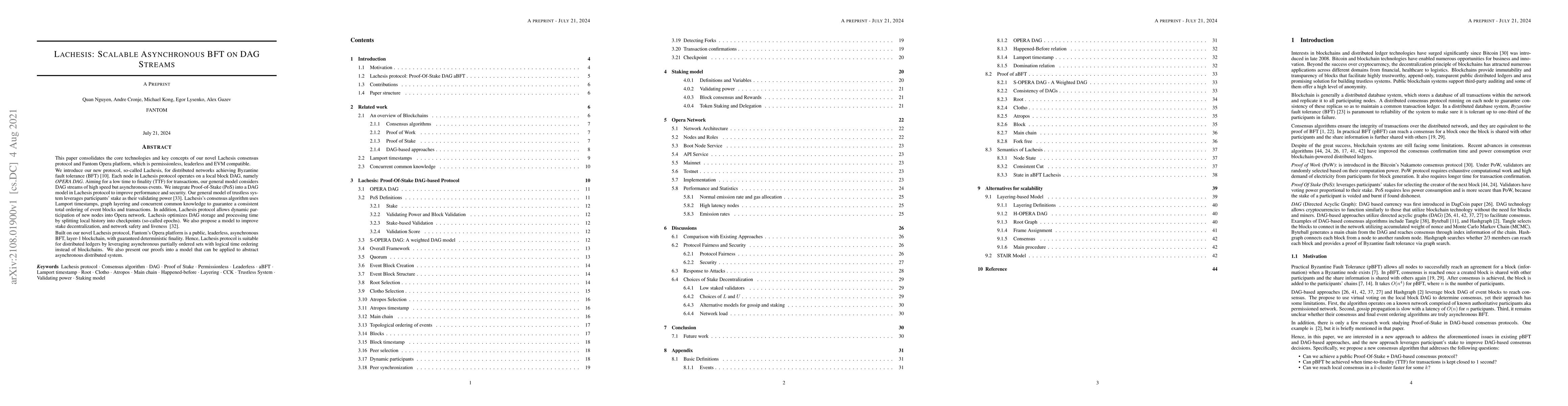 This paper consolidates the core technologies and key concepts of our novel Lachesis consensus protocol and Fantom Opera platform, which is permissionless, leaderless and EVM compatible. We introduce our new protocol, so-called Lachesis, for distributed networks achieving Byzantine fault tolerance (BFT)~\cite{lachesis01}. Each node in Lachesis protocol operates on a local block DAG, namely \emph{OPERA DAG}. Aiming for a low time to finality (TTF) for transactions, our general model considers DAG streams of high speed but asynchronous events. We integrate Proof-of-Stake (PoS) into a DAG model in Lachesis protocol to improve performance and security. Our general model of trustless system leverages participants' stake as their validating power~\cite{stakedag}. Lachesis's consensus algorithm uses Lamport timestamps, graph layering and concurrent common knowledge to guarantee a consistent total ordering of event blocks and transactions. In addition, Lachesis protocol allows dynamic participation of new nodes into Opera network. Lachesis optimizes DAG storage and processing time by splitting local history into checkpoints (so-called epochs). We also propose a model to improve stake decentralization, and network safety and liveness ~\cite{stairdag}. Built on our novel Lachesis protocol, Fantom's Opera platform is a public, leaderless, asynchronous BFT, layer-1 blockchain, with guaranteed deterministic finality. Hence, Lachesis protocol is suitable for distributed ledgers by leveraging asynchronous partially ordered sets with logical time ordering instead of blockchains. We also present our proofs into a model that can be applied to abstract asynchronous distributed system.