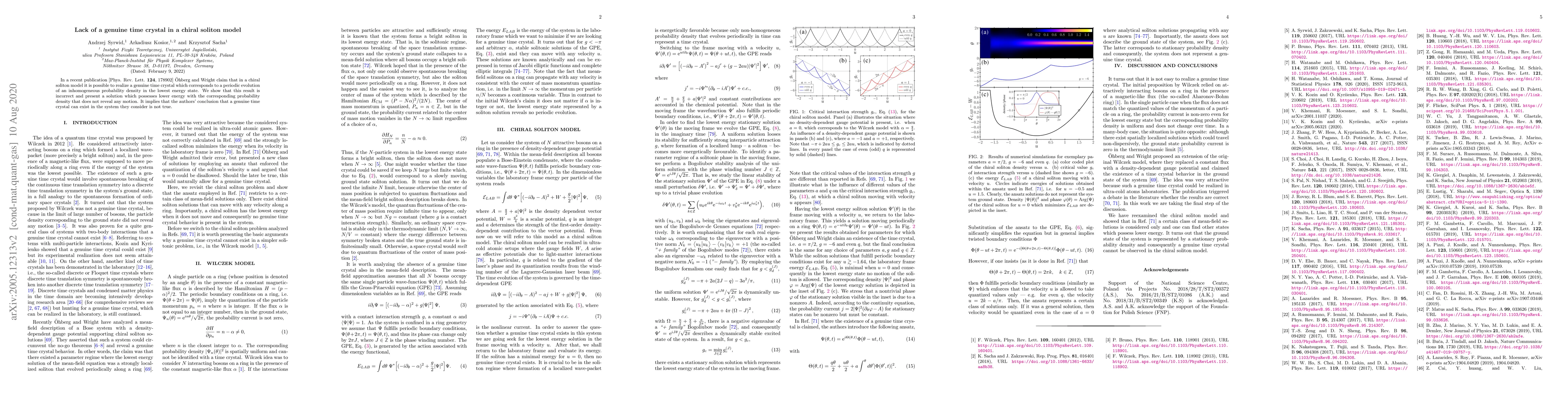 In a recent publication [Phys. Rev. Lett. {\bf 124}, 178902] \"Ohberg and Wright claim that in a chiral soliton model it is possible to realize a genuine time crystal which corresponds to a periodic evolution of an inhomogeneous probability density in the lowest energy state. We show that this result is incorrect and present a solution which possesses lower energy with the corresponding probability density that does not reveal any motion. It implies that the authors' conclusion that a genuine time crystal can exist in the system they consider is not true.