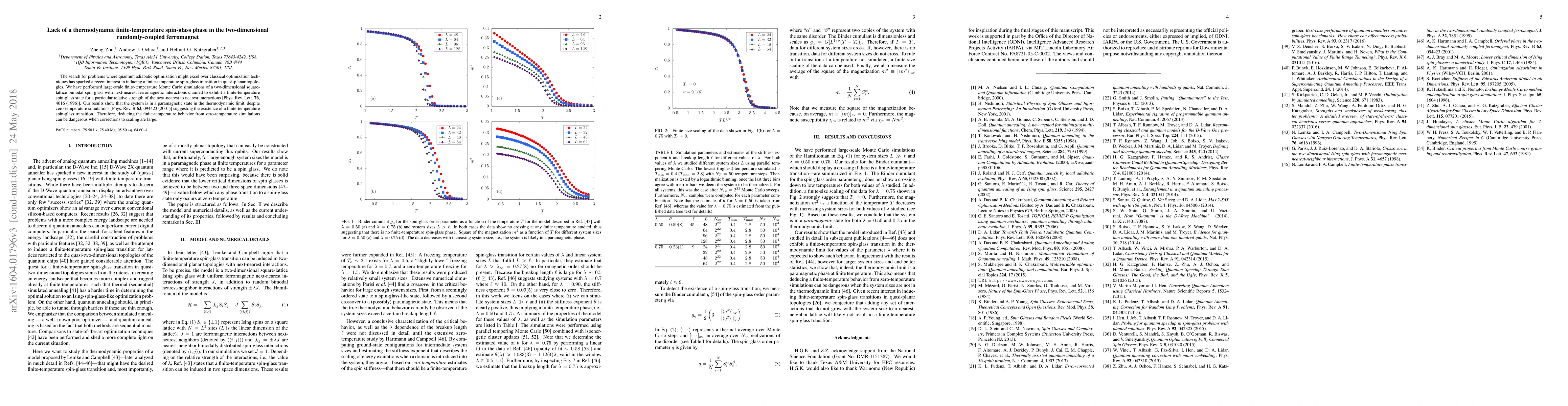 The search for problems where quantum adiabatic optimization might excel over classical optimization techniques has sparked a recent interest in inducing a finite-temperature spin-glass transition in quasi-planar topologies. We have performed large-scale finite-temperature Monte Carlo simulations of a two-dimensional square-lattice bimodal spin glass with next-nearest ferromagnetic interactions claimed to exhibit a finite-temperature spin-glass state for a particular relative strength of the next-nearest to nearest interactions [Phys. Rev. Lett. 76, 4616 (1996)]. Our results show that the system is in a paramagnetic state in the thermodynamic limit, despite zero-temperature simulations [Phys. Rev. B 63, 094423 (2001)] suggesting the existence of a finite-temperature spin-glass transition. Therefore, deducing the finite-temperature behavior from zero-temperature simulations can be dangerous when corrections to scaling are large.