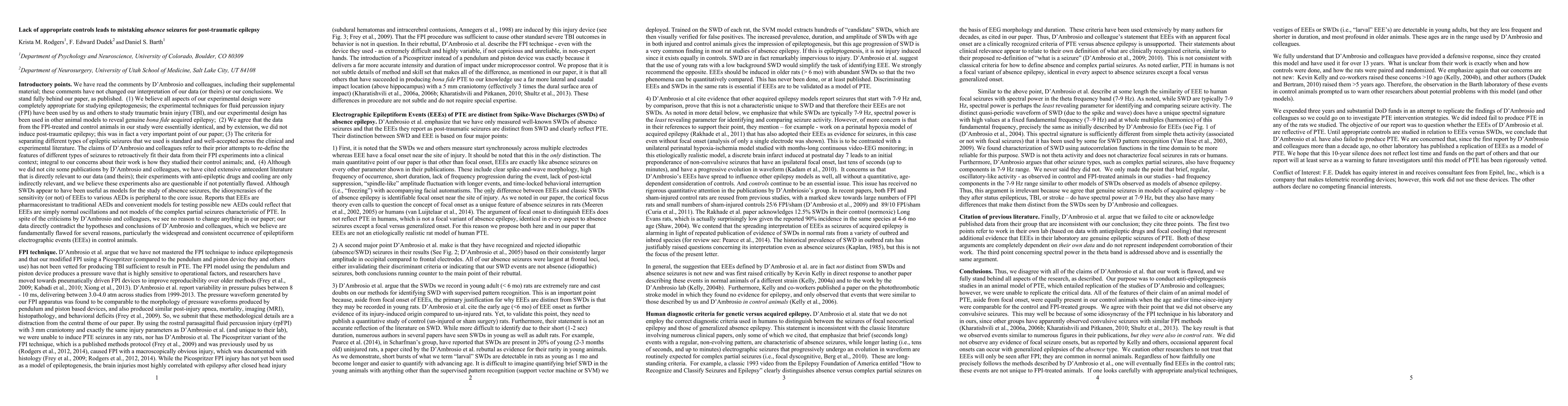 Here we provide a thorough discussion of a rebuttal by D'Ambrosio et al to a study conducted by Rodgers et al. (Rodgers KM, Dudek FE, Barth DS (2015) Progressive, Seizure-Like, Spike- Wave Discharges Are Common in Both Injured and Uninjured Sprague-Dawley Rats: Implications for the Fluid Percussion Injury Model of Post-Traumatic Epilepsy. J Neurosci. 35(24):9194-204. doi: 10.1523/JNEUROSCI.0919-15.2015.) to investigate focal seizures and acquired epileptogenesis induced by head injury in the rat. This manuscript serves as supplementary document for our letter to the Editor to appear in the Journal of Neuroscience. We find the rebuttal is flawed on all points, particularly concerning use of proper controls, experimental methods, analytical methods, and epilepsy diagnostic criteria, leading to mistaking absence seizures for post-traumatic epilepsy.