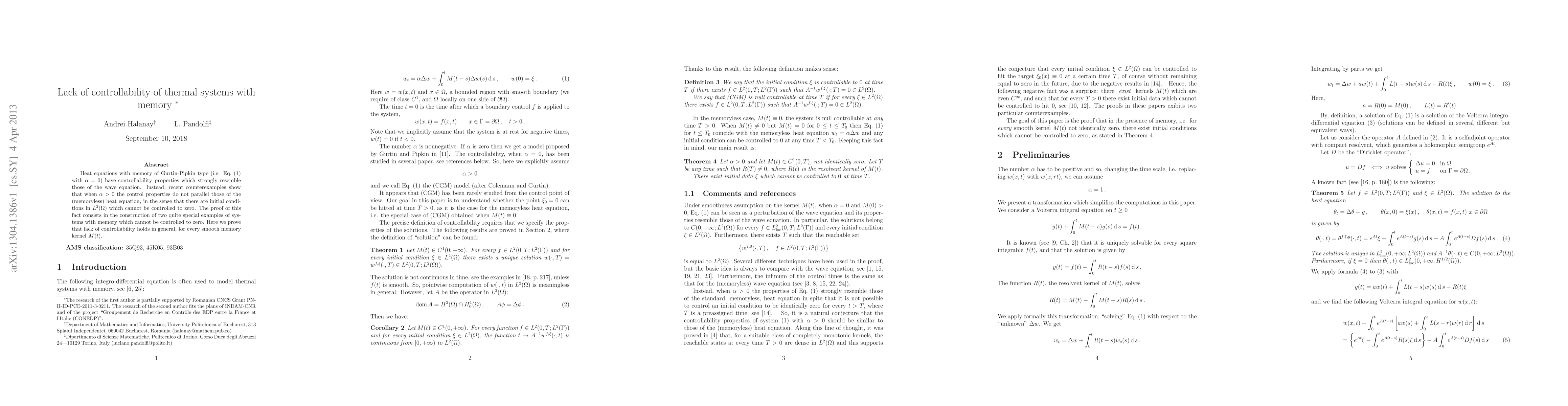 Heat equations with memory of Gurtin-Pipkin type have controllability properties which strongly resemble those of the wave equation. Instead, recent counterexamples show that when the laplacian appears also out of the memory term, the control properties do not parallel those of the (memoryless) heat equation, in the sense that there are $L^2$-initial conditions which cannot be controlled to zero. The proof of this fact (presented in previous papers) consists in the construction of two quite special examples of systems with memory which cannot be controlled to zero. Here we prove that lack of controllability holds in general, for every systems with smooth memory kernel.