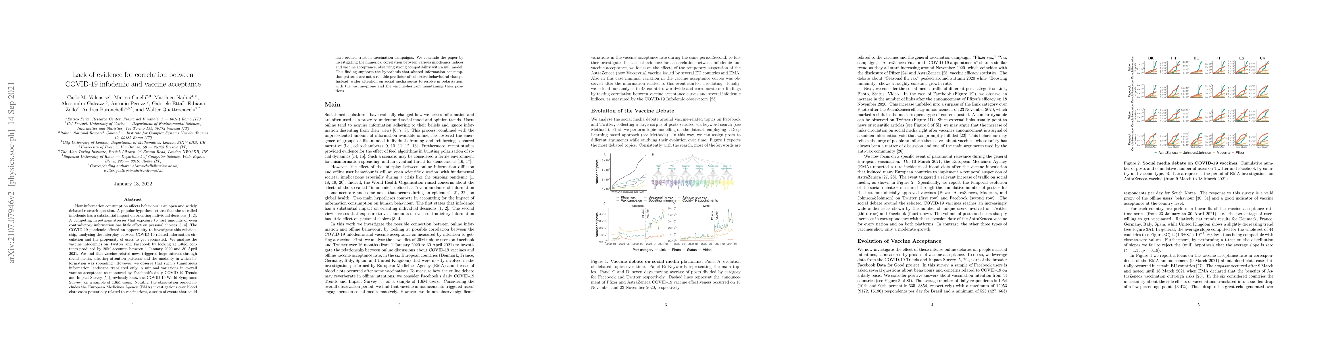 The study finds no significant correlation between the COVID-19 infodemic on social media and changes in vaccine acceptance, despite high information circulation. The analysis of 146M contents from 20M accounts shows minimal variations in vaccine acceptance, supporting the hypothesis that information consumption does not reliably predict collective behavioural change.