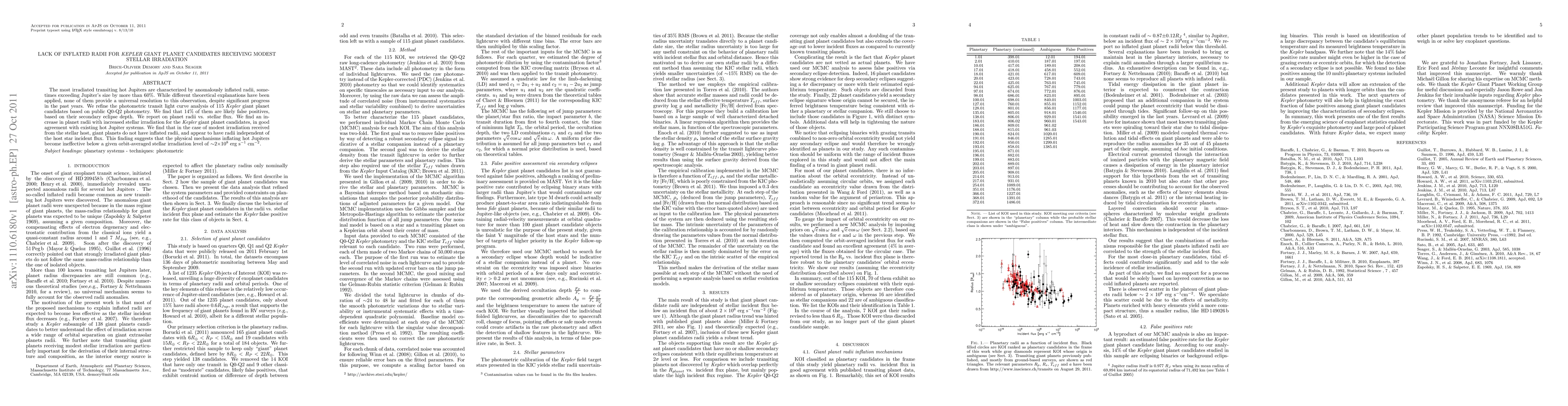 The most irradiated transiting hot Jupiters are characterized by anomalously inflated radii, sometimes exceeding Jupiter's size by more than 60%. While different theoretical explanations have been applied, none of them provide a universal resolution to this observation, despite significant progress in the past years. We refine the photometric transit light curve analysis of 115 Kepler giant planet candidates based on public Q0-Q2 photometry. We find that 14% of them are likely false positives, based on their secondary eclipse depth. We report on planet radii vs. stellar flux. We find an increase in planet radii with increased stellar irradiation for the Kepler giant planet candidates, in good agreement with existing hot Jupiter systems. We find that in the case of modest irradiation received from the stellar host, giant planets do not have inflated radii, and appear to have radii independent of the host star incident flux. This finding suggests that the physical mechanisms inflating hot Jupiters become ineffective below a given orbit-averaged stellar irradiation level of ~2 10^8 erg s^-1 cm^-2.