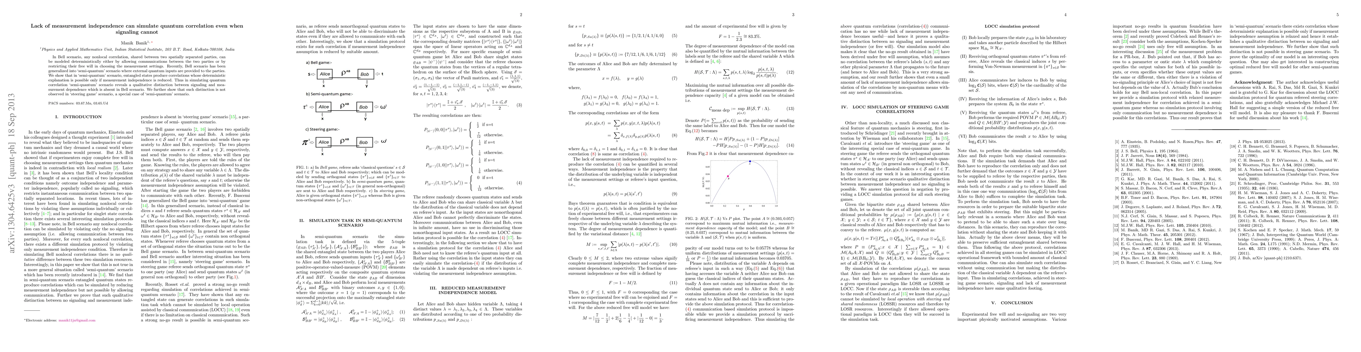 In Bell scenario, any nonlocal correlation, shared between two spatially separated parties, can be modeled deterministically either by allowing communications between the two parties or by restricting their free will in choosing the measurement settings. Recently, Bell scenario has been generalized into `semi-quantum' scenario where external quantum inputs are provided to the parties. We show that in `semi-quantum' scenario, entangled states produce correlations whose deterministic explanation is possible only if measurement independence is reduced. Thus in simulating quantum correlation `semi-quantum' scenario reveals a qualitative distinction between signaling and measurement dependence which is absent in Bell scenario. We further show that such distinction is not observed in `steering game' scenario, a special case of `semi-quantum' scenario.