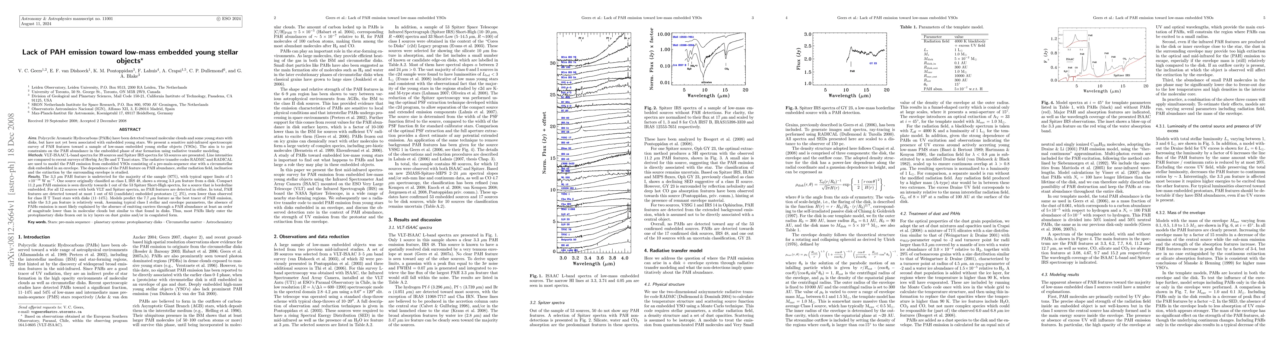 PAHs have been detected toward molecular clouds and some young stars with disks, but have not yet been associated with embedded young stars. We present a sensitive mid-IR spectroscopic survey of PAH features toward a sample of low-mass embedded YSOs. The aim is to put constraints on the PAH abundance in the embedded phase of star formation using radiative transfer modeling. VLT-ISAAC L-band spectra for 39 sources and Spitzer IRS spectra for 53 sources are presented. Line intensities are compared to recent surveys of Herbig Ae/Be and T Tauri stars. The radiative transfer codes RADMC and RADICAL are used to model the PAH emission from embedded YSOs consisting of a PMS star with a circumstellar disk embedded in an envelope. The dependence of the PAH feature on PAH abundance, stellar radiation field, inclination and the extinction by the surrounding envelope is studied. The 3.3 micron PAH feature is undetected for the majority of the sample (97%), with typical upper limits of 5E-16 W/m^2. Compact 11.2 micron PAH emission is seen directly towards 1 out of the 53 Spitzer Short-High spectra, for a source that is borderline embedded. For all 12 sources with both VLT and Spitzer spectra, no PAH features are detected in either. In total, PAH features are detected toward at most 1 out of 63 (candidate) embedded protostars (<~ 2%), even lower than observed for class II T Tauri stars with disks (11-14%). Assuming typical class I stellar and envelope parameters, the absence of PAHs emission is most likely explained by the absence of emitting carriers through a PAH abundance at least an order of magnitude lower than in molecular clouds but similar to that found in disks. Thus, most PAHs likely enter the protoplanetary disks frozen out in icy layers on dust grains and/or in coagulated form.