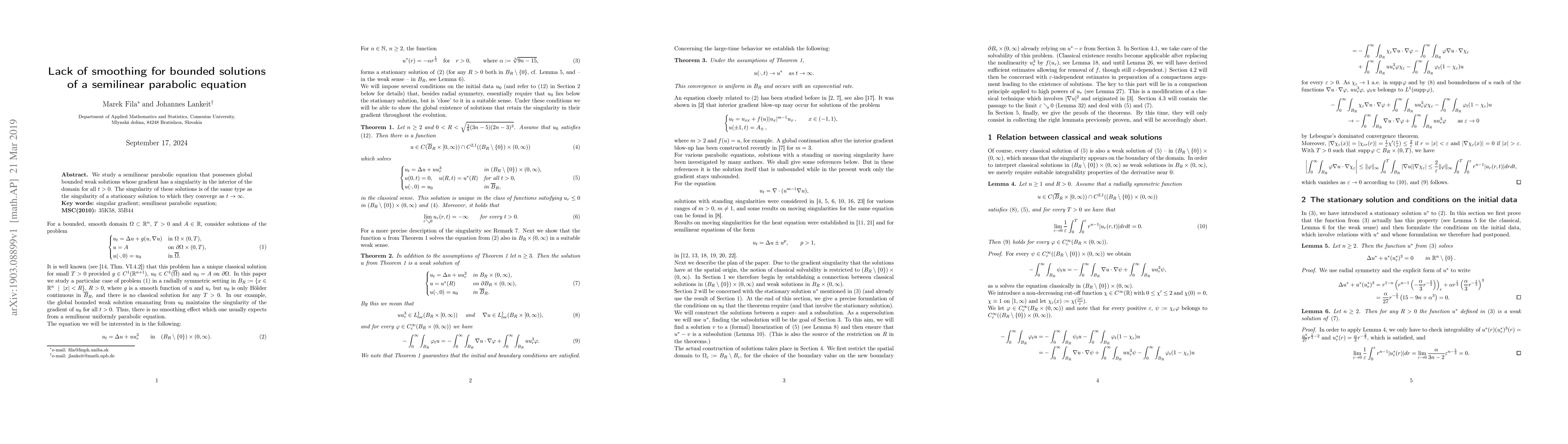 Summary: This paper investigates a semilinear parabolic equation with global bounded weak solutions exhibiting interior gradient singularities, which converge to a stationary solution singularity as time approaches infinity. The study highlights the lack of smoothing for these singularities.