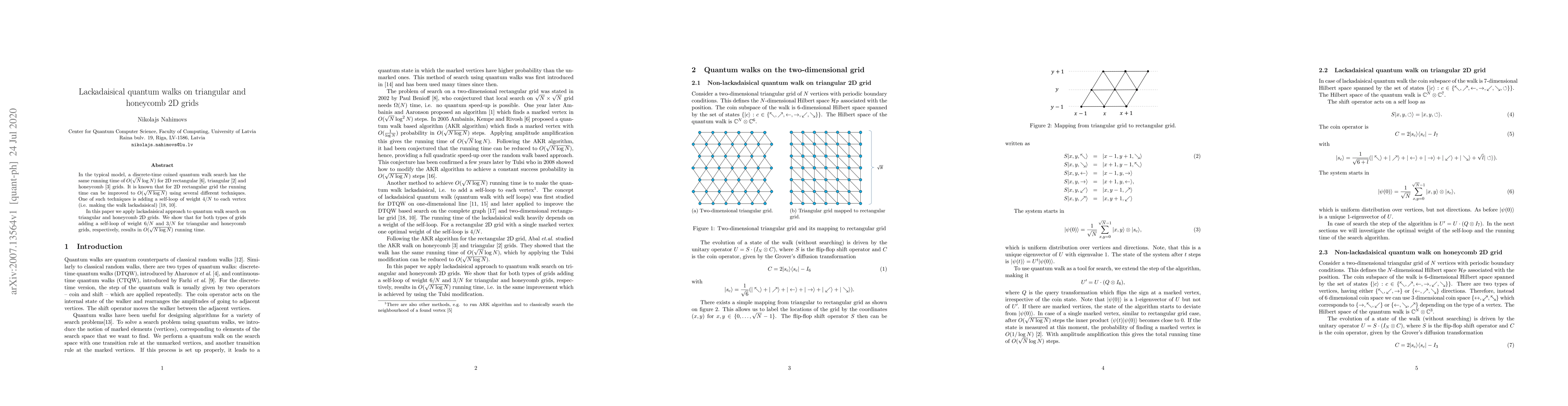 The research applies the lackadaisical quantum walk approach to triangular and honeycomb 2D grids, modifying the coin operator and adding self-loops of specific weights to improve search efficiency.