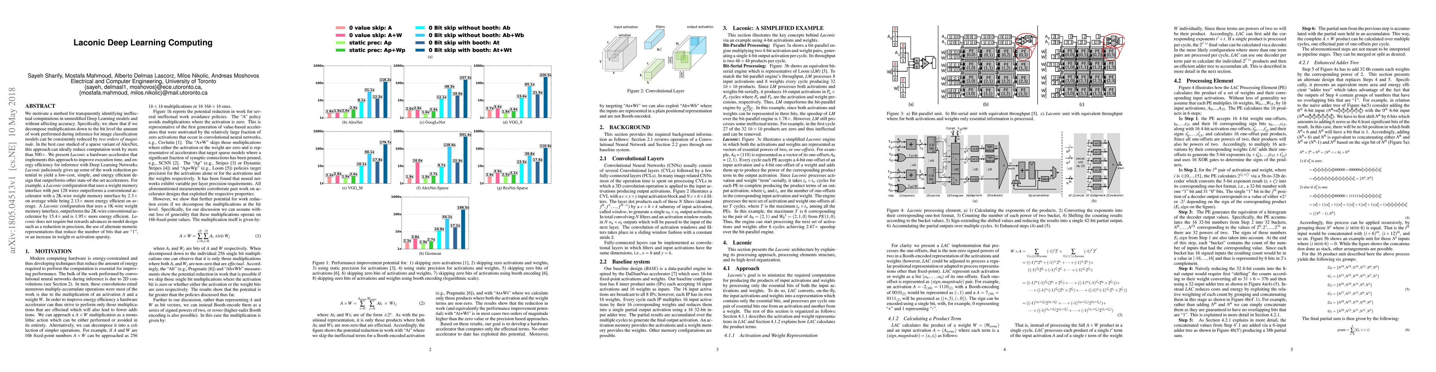 This paper proposes Laconic, a method to identify and reduce ineffectual computations in unmodified Deep Learning models without compromising accuracy. It demonstrates a two-order reduction in computation work during inference, achieving up to 500x less work in the best case. Laconic hardware accelerators significantly improve execution time and energy efficiency, outperforming conventional accelerators by large margins while using fewer wires.