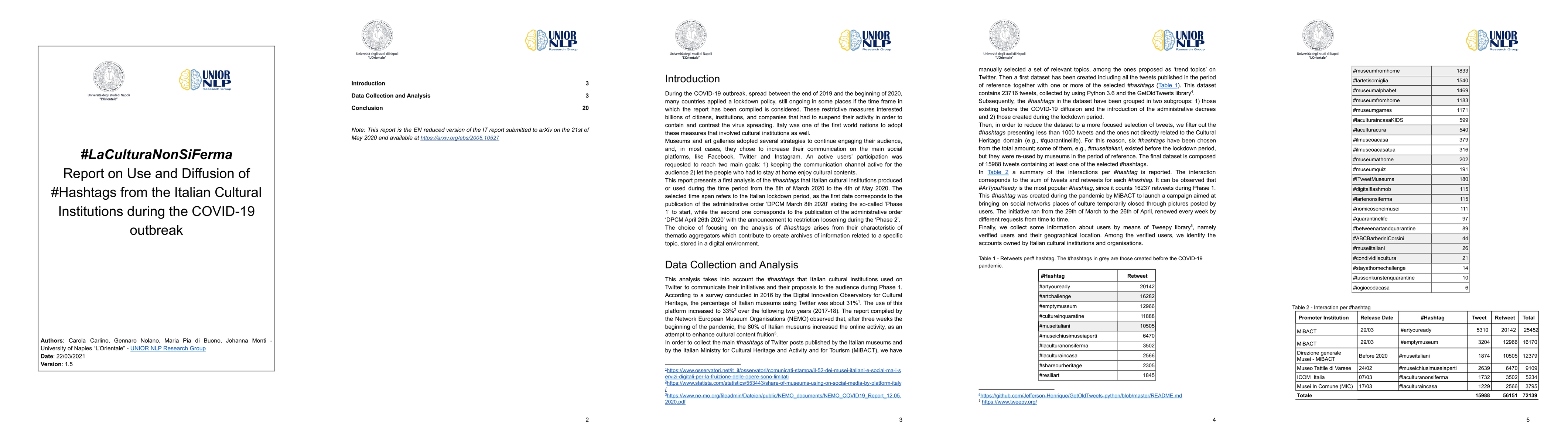 This report presents an analysis of #hashtags used by Italian Cultural Heritage institutions to promote and communicate cultural content during the COVID-19 lock-down period in Italy. Several activities to support and engage users' have been proposed using social media. Most of these activities present one or more #hashtags which help to aggregate content and create a community on specific topics. Results show that on one side Italian institutions have been very proactive in adapting to the pandemic scenario and on the other side users' reacted very positively increasing their participation in the proposed activities.