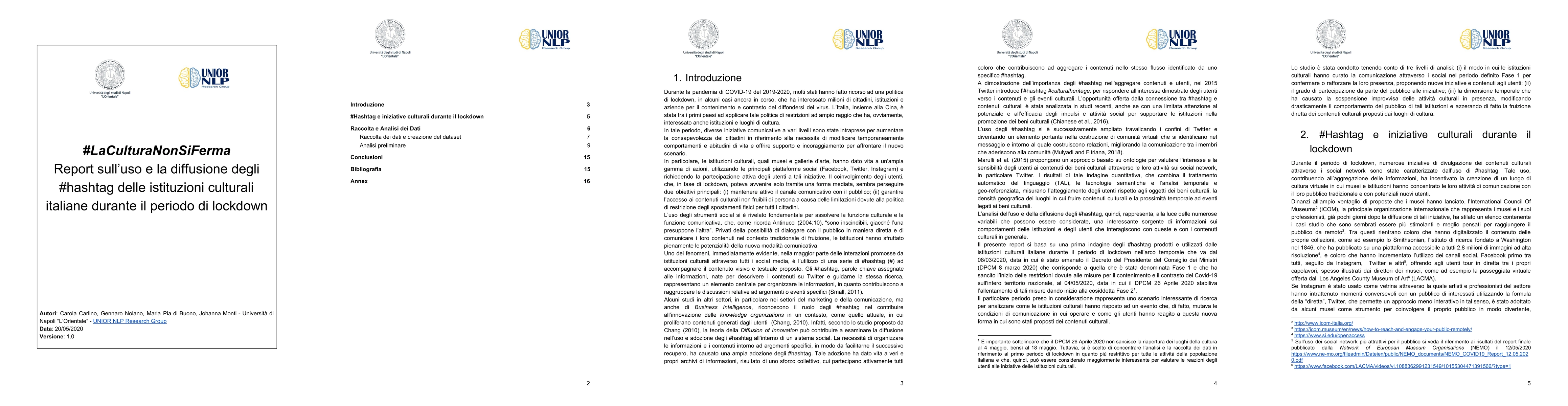 This report presents an analysis of #hashtags used by Italian Cultural Heritage institutions to promote and communicate cultural content during the COVID-19 lock-down period in Italy. Several activities to support and engage users' have been proposed using social media. Most of these activities present one or more #hashtags which help to aggregate content and create a community on specific topics. Results show that on one side Italian institutions have been very proactive in adapting to the pandemic scenario and on the other side users' reacted very positively increasing their participation in the proposed activities.