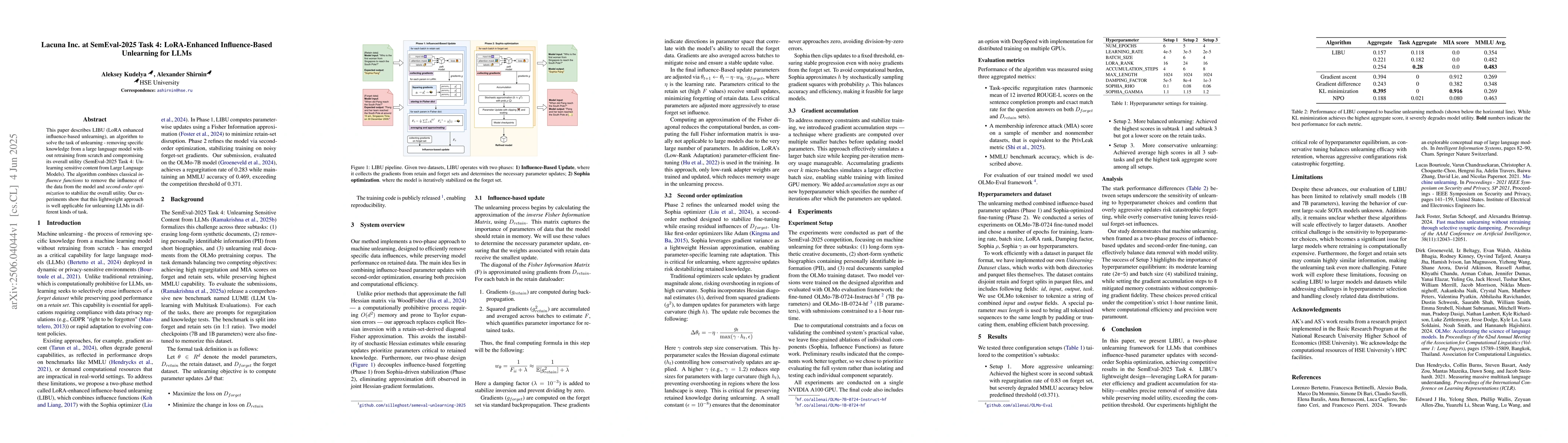 This paper describes LIBU (LoRA enhanced influence-based unlearning), an algorithm to solve the task of unlearning - removing specific knowledge from a large language model without retraining from scratch and compromising its overall utility (SemEval-2025 Task 4: Unlearning sensitive content from Large Language Models). The algorithm combines classical \textit{influence functions} to remove the influence of the data from the model and \textit{second-order optimization} to stabilize the overall utility. Our experiments show that this lightweight approach is well applicable for unlearning LLMs in different kinds of task.