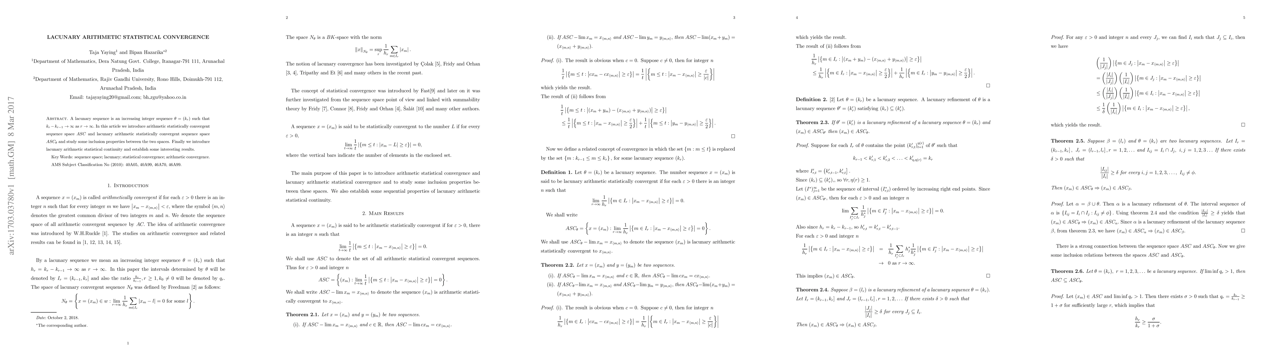 A lacunary sequence is an increasing integer sequence $\theta=(k_r)$ such that $k_r-k_{r-1}\rightarrow \infty$ as $r\rightarrow \infty.$ In this article we introduce arithmetic statistically convergent sequence space $ASC$ and lacunary arithmetic statistically convergent sequence space $ASC_{\theta}$ and study some inclusion properties between the two spaces. Finally we introduce lacunary arithmetic statistical continuity and establish some interesting results.
