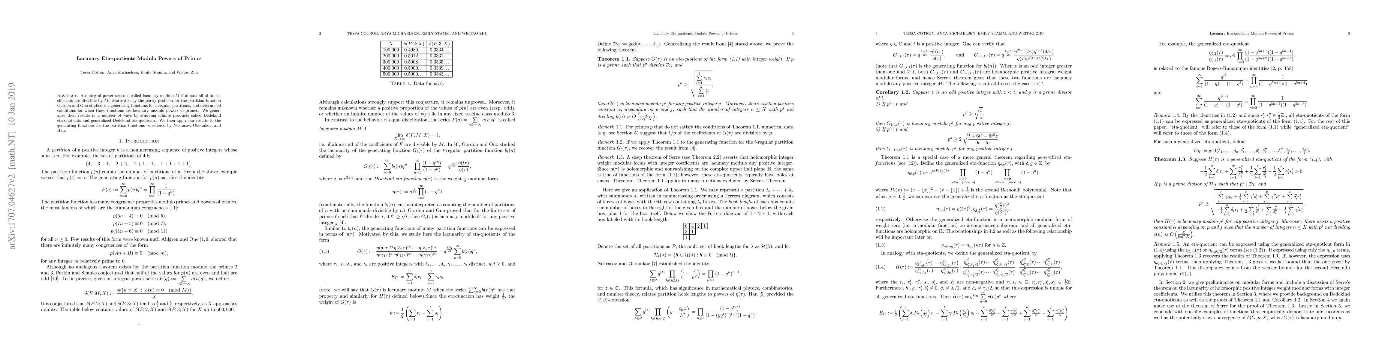 This paper generalizes results on lacunary power series, specifically Dedekind eta-quotients, determining conditions for their coefficients to be divisible by powers of primes. The findings extend prior work on generating functions for $t$-regular partitions and apply to partition functions studied by Nekrasov, Okounkov, and Han.