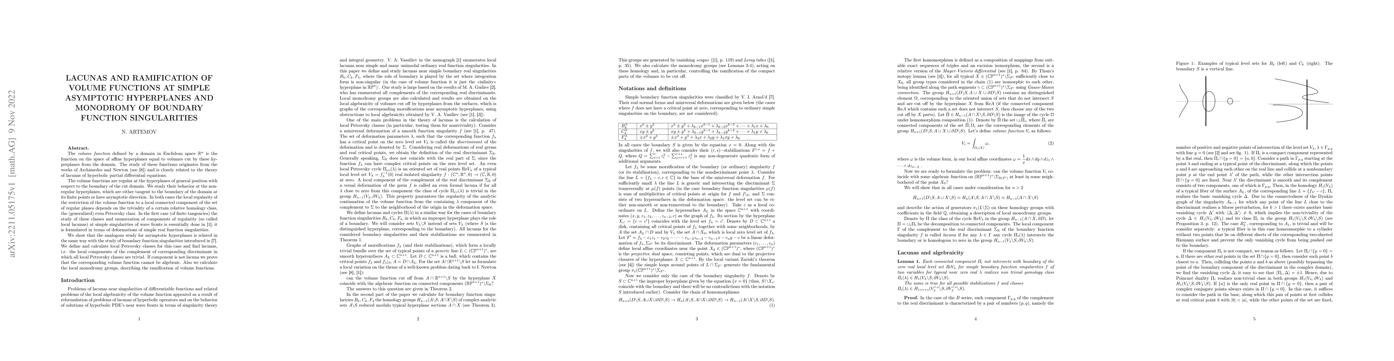 The volume function defined by a domain in Euclidean space $\mathbb{R}^n$ is the function on the space of affine hyperplanes equal to volumes cut by these hyperplanes from the domain. The study of these functions originates from the works of Archimedes and Newton and is closely related to the theory of lacunas of hyperbolic partial differential equations.The volume functions are regular at the hyperplanes of general position with respect to the boundary of the cut domain. We study their behavior at the non-regular hyperplanes, which are either tangent to the boundary of the domain at its finite points or have asymptotic direction. In both cases the local regularity of the restriction of the volume function to a local connected component of the set of regular planes depends on the triviality of a certain relative homology class, the (generalized) even Petrovsky class. In the first case (of finite tangencies) the study of these classes and enumeration of components of regularity (so called local lacunas) at simple singularities of wave fronts was essentially done by V. A. Vassiliev; it is formulated in terms of deformations of simple real function singularities. We show that the analogous study for asymptotic hyperplanes is related in the same way with the study of boundary function singularities. We define and calculate local Petrovsky classes for this case and find lacunas, i.e. the local components of the complement of corresponding discriminant in which all local Petrovsky classes are trivial. If component is not lacuna we prove that the corresponding volume function cannot be algebraic. Also we calculate the local monodromy groups, describing the ramification of volume functions.
