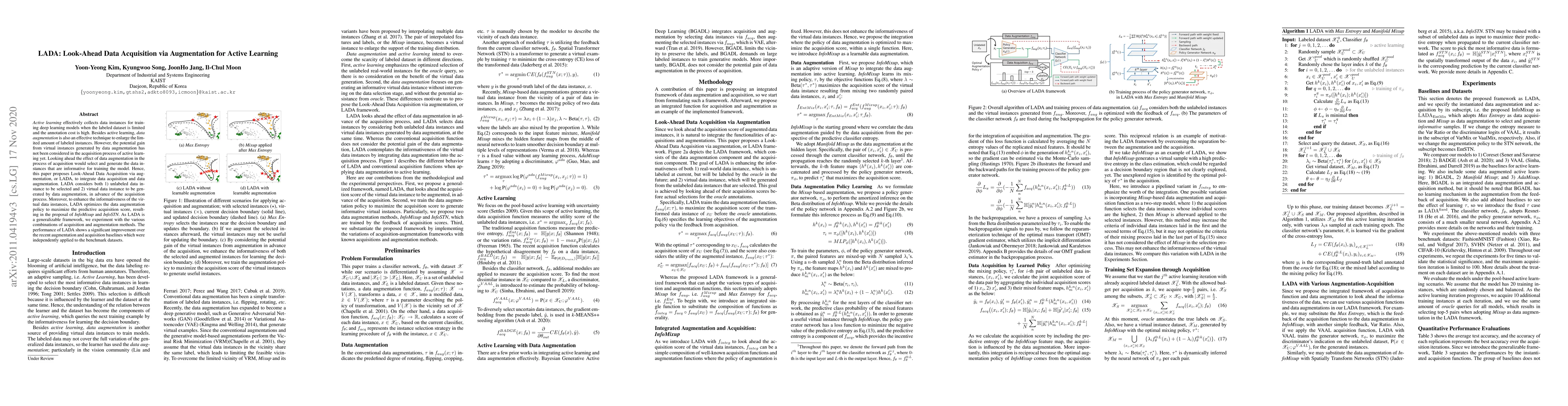 This paper introduces LADA, a framework that integrates active learning with data augmentation to optimize the selection of unlabeled data and the generation of augmented data, enhancing model training efficiency. LADA's approach, InfoMixup and InfoSTN, demonstrates significant improvements over existing methods on benchmark datasets.