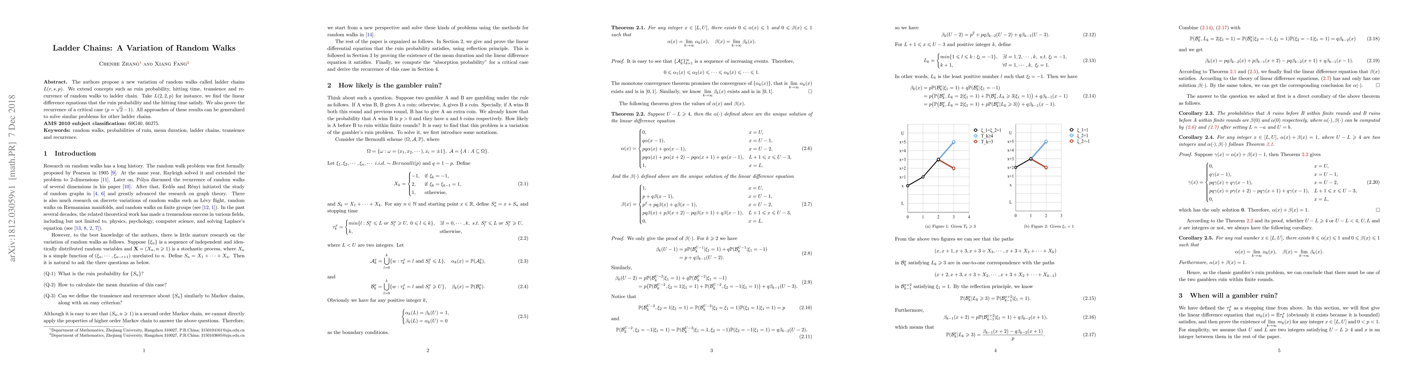 Summary: The paper introduces ladder chains, a novel variation of random walks, and extends concepts like ruin probability and hitting time to this framework. For a specific case, $L(2,2,p)$, it derives linear difference equations and proves recurrence for a critical probability. Generalization techniques are provided for broader application.