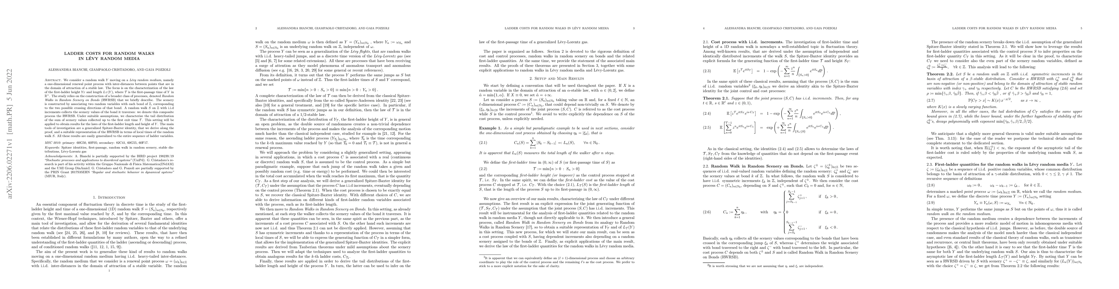 We consider a random walk $Y$ moving on a \emph{L\'evy random medium}, namely a one-dimensional renewal point process with inter-distances between points that are in the domain of attraction of a stable law. The focus is on the characterization of the law of the first-ladder height $Y_{\mathcal{T}}$ and length $L_{\mathcal{T}}(Y)$, where $\mathcal{T}$ is the first-passage time of $Y$ in $\mathbb{R}^+$. The study relies on the construction of a broader class of processes, denoted \emph{Random Walks in Random Scenery on Bonds} (RWRSB) that we briefly describe. The scenery is constructed by associating two random variables with each bond of $\mathbb{Z}$, corresponding to the two possible crossing directions of that bond. A random walk $S$ on $\mathbb{Z}$ with i.i.d increments collects the scenery values of the bond it traverses: we denote this composite process the RWRSB. Under suitable assumptions, we characterize the tail distribution of the sum of scenery values collected up to the first exit time $\mathcal{T}$. This setting will be applied to obtain results for the laws of the first-ladder length and height of $Y$. The main tools of investigation are a generalized Spitzer-Baxter identity, that we derive along the proof, and a suitable representation of the RWRSB in terms of local times of the random walk $S$. All these results are easily generalized to the entire sequence of ladder variables.