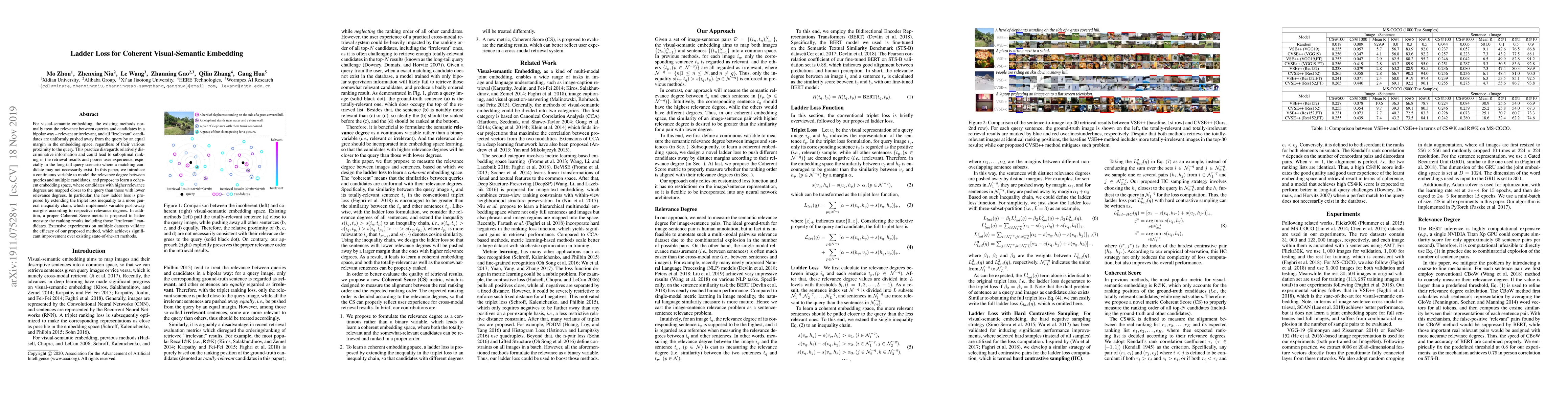 For visual-semantic embedding, the existing methods normally treat the relevance between queries and candidates in a bipolar way -- relevant or irrelevant, and all "irrelevant" candidates are uniformly pushed away from the query by an equal margin in the embedding space, regardless of their various proximity to the query. This practice disregards relatively discriminative information and could lead to suboptimal ranking in the retrieval results and poorer user experience, especially in the long-tail query scenario where a matching candidate may not necessarily exist. In this paper, we introduce a continuous variable to model the relevance degree between queries and multiple candidates, and propose to learn a coherent embedding space, where candidates with higher relevance degrees are mapped closer to the query than those with lower relevance degrees. In particular, the new ladder loss is proposed by extending the triplet loss inequality to a more general inequality chain, which implements variable push-away margins according to respective relevance degrees. In addition, a proper Coherent Score metric is proposed to better measure the ranking results including those "irrelevant" candidates. Extensive experiments on multiple datasets validate the efficacy of our proposed method, which achieves significant improvement over existing state-of-the-art methods.