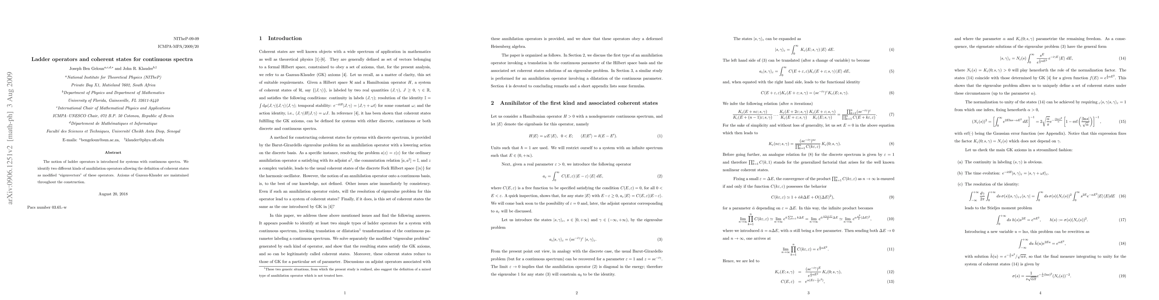 This paper introduces ladder operators for systems with continuous spectra, defining two types of annihilation operators that enable the construction of coherent states as modified "eigenvectors." The construction adheres to the Gazeau-Klauder axioms.