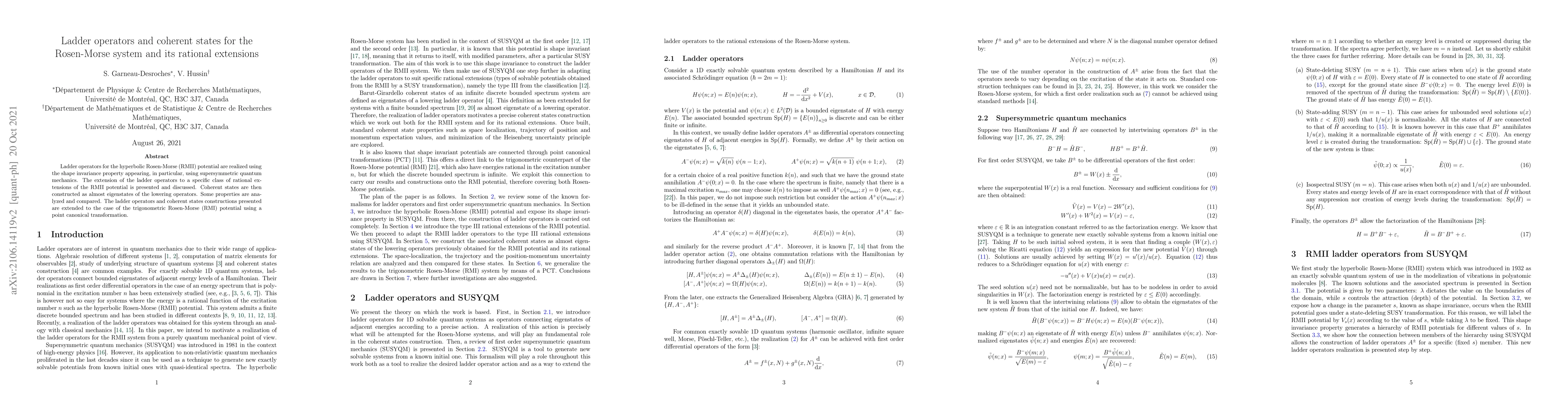 This paper develops ladder operators and constructs coherent states for the hyperbolic and trigonometric Rosen-Morse potentials, utilizing shape invariance and supersymmetric quantum mechanics. It extends these methods to rational extensions of the hyperbolic potential and analyzes their properties.