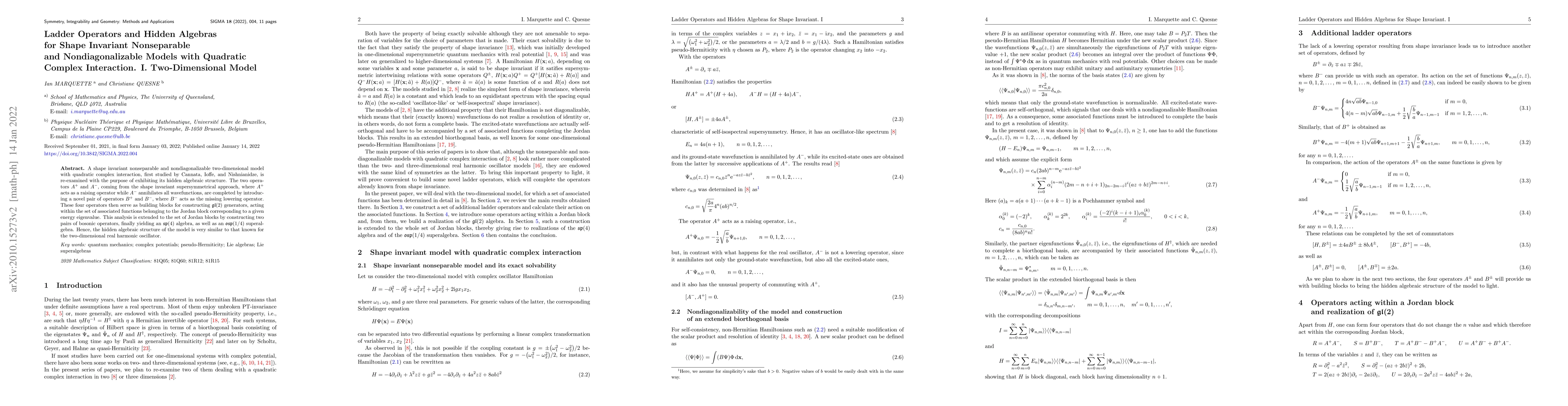 This paper re-examines a two-dimensional shape invariant model with quadratic complex interaction, revealing its hidden algebraic structure through the construction of ladder operators $A^+$, $A^-$, $B^+$, and $B^-$. The operators form ${\mathfrak{gl}}(2)$ generators and extend to ${\mathfrak{sp}}(4)$ and ${\mathfrak{osp}}(1/4)$ algebras, mirroring the structure of the two-dimensional real harmonic oscillator.