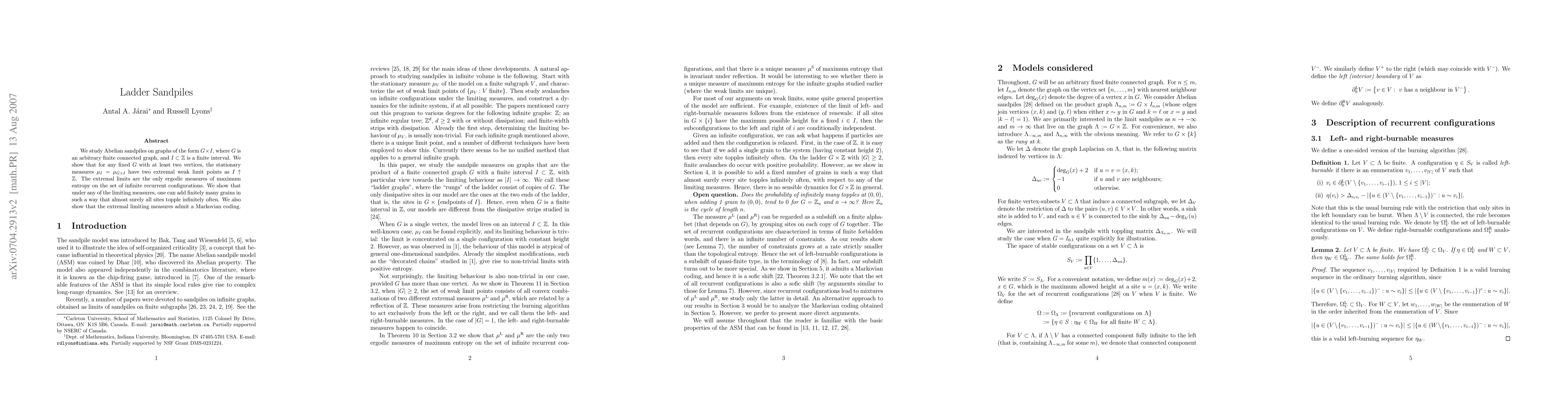 We study Abelian sandpiles on graphs of the form $G \times I$, where $G$ is an arbitrary finite connected graph, and $I \subset \Z$ is a finite interval. We show that for any fixed $G$ with at least two vertices, the stationary measures $\mu_I = \mu_{G \times I}$ have two extremal weak limit points as $I \uparrow \Z$. The extremal limits are the only ergodic measures of maximum entropy on the set of infinite recurrent configurations. We show that under any of the limiting measures, one can add finitely many grains in such a way that almost surely all sites topple infinitely often. We also show that the extremal limiting measures admit a Markovian coding.