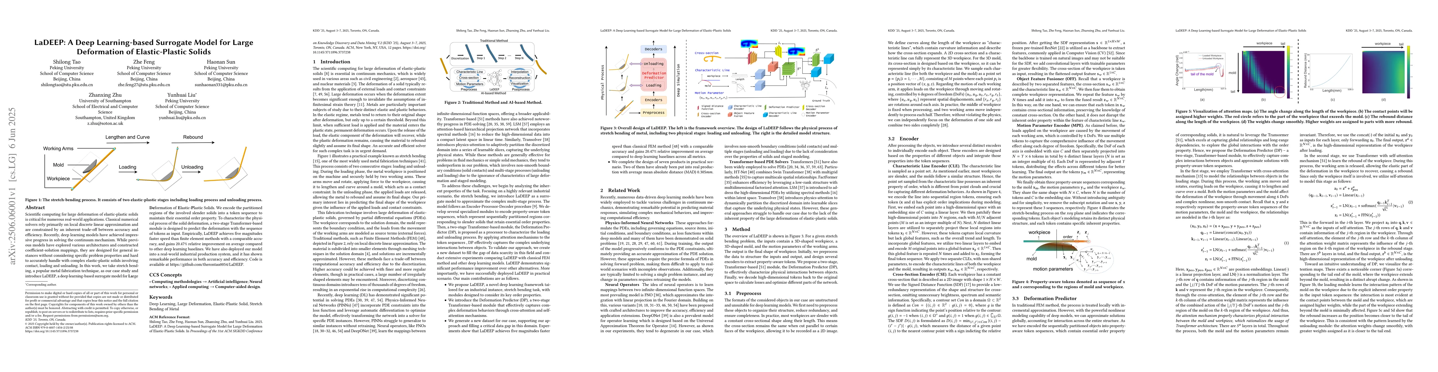 The research introduces LaDEEP, a deep learning-based surrogate model for large deformation of elastic-plastic solids, focusing on stretch bending as a case study. It encodes partitioned regions of slender solids into token sequences and uses a two-stage Transformer-based module to predict deformation, maintaining the order property of the regions.