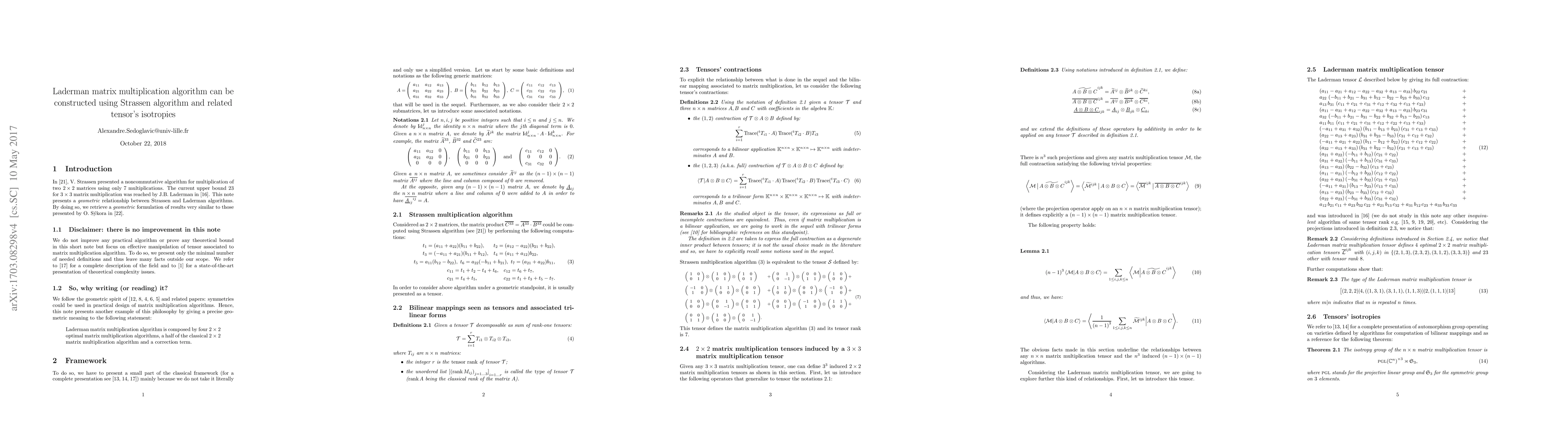 This paper explores a geometric relationship between Strassen's 1969 algorithm for 2x2 matrix multiplication and Laderman's 1976 algorithm for 3x3 matrix multiplication, utilizing tensor isotropies to construct Laderman's method from Strassen's. It also aligns with Sykora's 1977 geometric formulations.