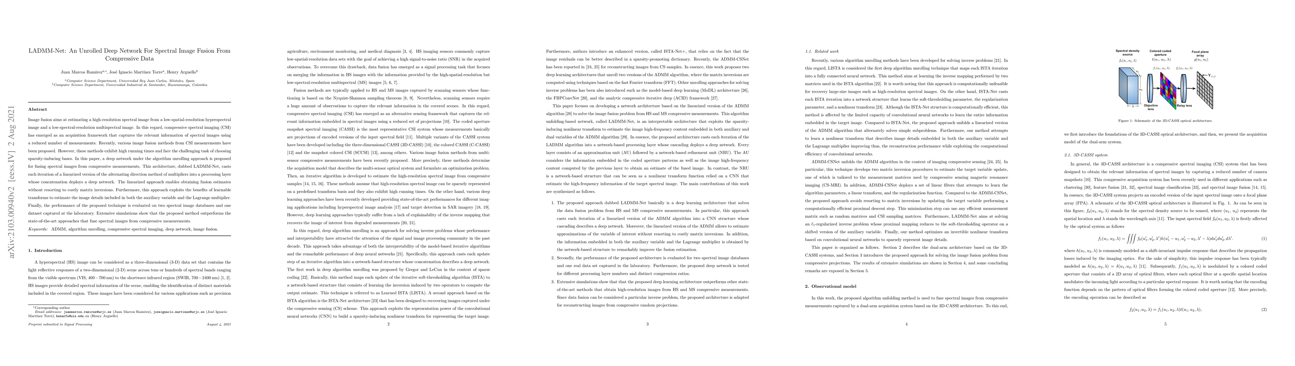 LADMM-Net is an unrolled deep network designed to fuse high-resolution spectral images from compressive data, achieving superior performance over existing methods by avoiding costly matrix inversions and leveraging learnable transforms. The proposed method outperforms state-of-the-art techniques in extensive simulations.