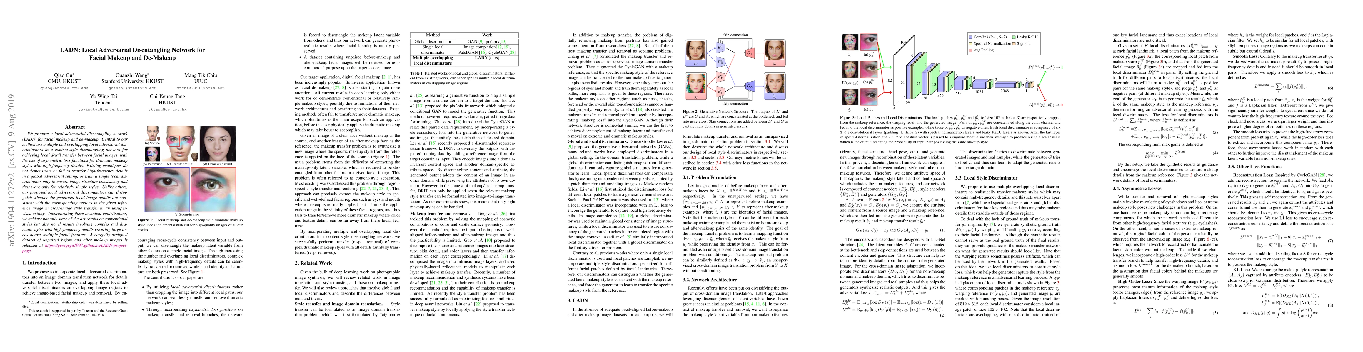 We propose a local adversarial disentangling network (LADN) for facial makeup and de-makeup. Central to our method are multiple and overlapping local adversarial discriminators in a content-style disentangling network for achieving local detail transfer between facial images, with the use of asymmetric loss functions for dramatic makeup styles with high-frequency details. Existing techniques do not demonstrate or fail to transfer high-frequency details in a global adversarial setting, or train a single local discriminator only to ensure image structure consistency and thus work only for relatively simple styles. Unlike others, our proposed local adversarial discriminators can distinguish whether the generated local image details are consistent with the corresponding regions in the given reference image in cross-image style transfer in an unsupervised setting. Incorporating these technical contributions, we achieve not only state-of-the-art results on conventional styles but also novel results involving complex and dramatic styles with high-frequency details covering large areas across multiple facial features. A carefully designed dataset of unpaired before and after makeup images is released.