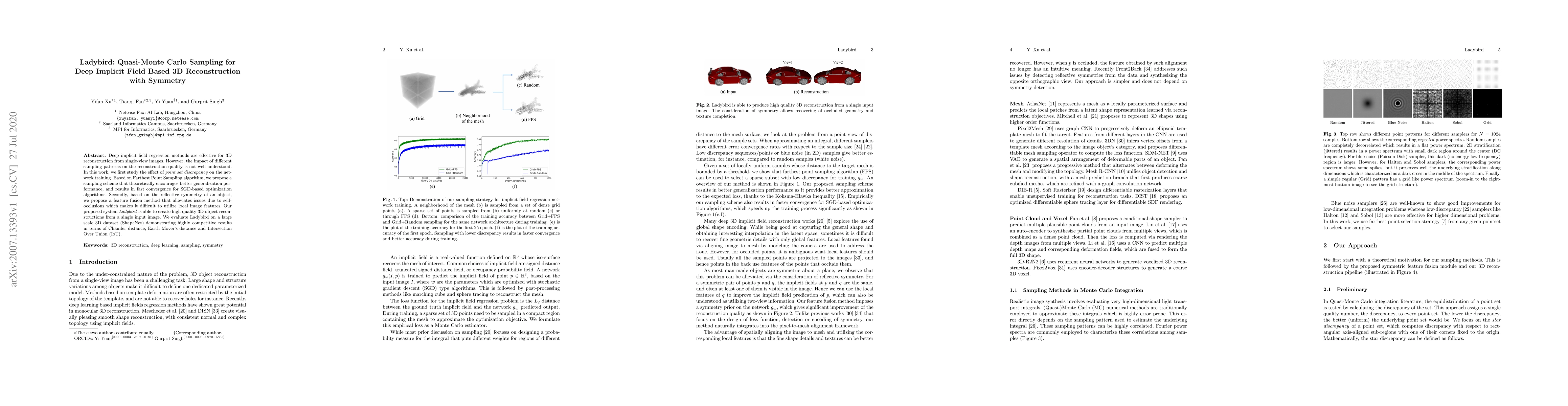 Deep implicit field regression methods are effective for 3D reconstruction from single-view images. However, the impact of different sampling patterns on the reconstruction quality is not well-understood. In this work, we first study the effect of point set discrepancy on the network training. Based on Farthest Point Sampling algorithm, we propose a sampling scheme that theoretically encourages better generalization performance, and results in fast convergence for SGD-based optimization algorithms. Secondly, based on the reflective symmetry of an object, we propose a feature fusion method that alleviates issues due to self-occlusions which makes it difficult to utilize local image features. Our proposed system Ladybird is able to create high quality 3D object reconstructions from a single input image. We evaluate Ladybird on a large scale 3D dataset (ShapeNet) demonstrating highly competitive results in terms of Chamfer distance, Earth Mover's distance and Intersection Over Union (IoU).