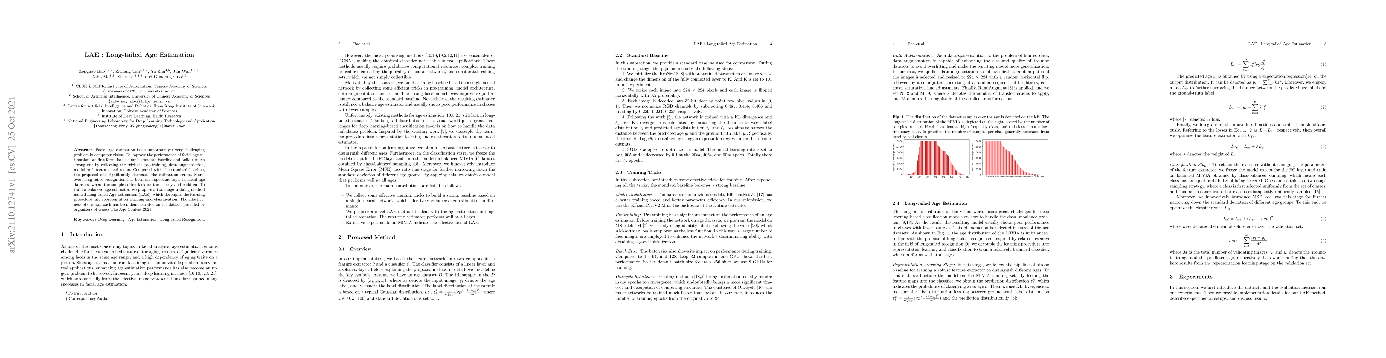 This paper proposes a Long-tailed Age Estimation (LAE) method to improve facial age estimation performance, especially for underrepresented age groups. The LAE method employs a two-stage training approach that enhances representation learning and classification, leading to significant reductions in estimation errors compared to baseline models.