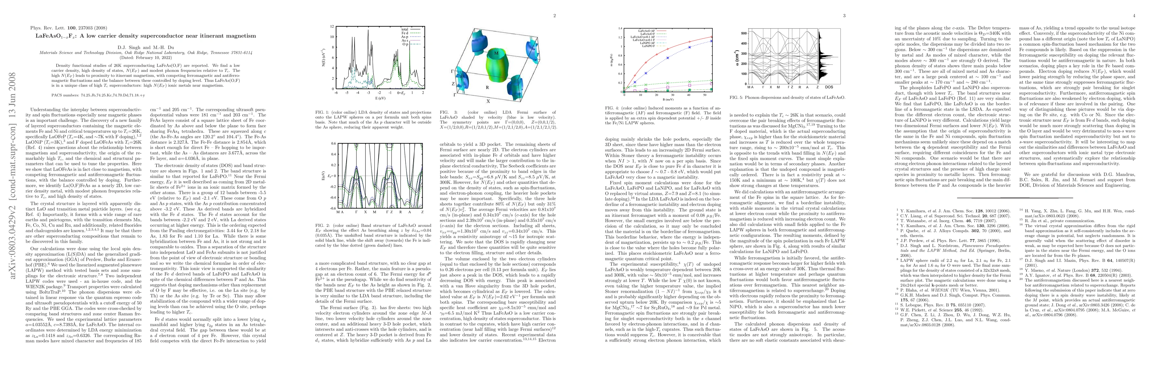 Density functional studies of 26K superconducting LaFeAs(O,F) are reported. We find a low carrier density, high density of states, $N(E_F)$ and modest phonon frequencies relative to $T_c$. The high $N(E_F)$ leads to proximity to itinerant magnetism, with competing ferromagnetic and antiferromagnetic fluctuations and the balance between these controlled by doping level. Thus LaFeAs(O,F) is in a unique class of high $T_c$ superconductors: high $N(E_F)$ ionic metals near magnetism.