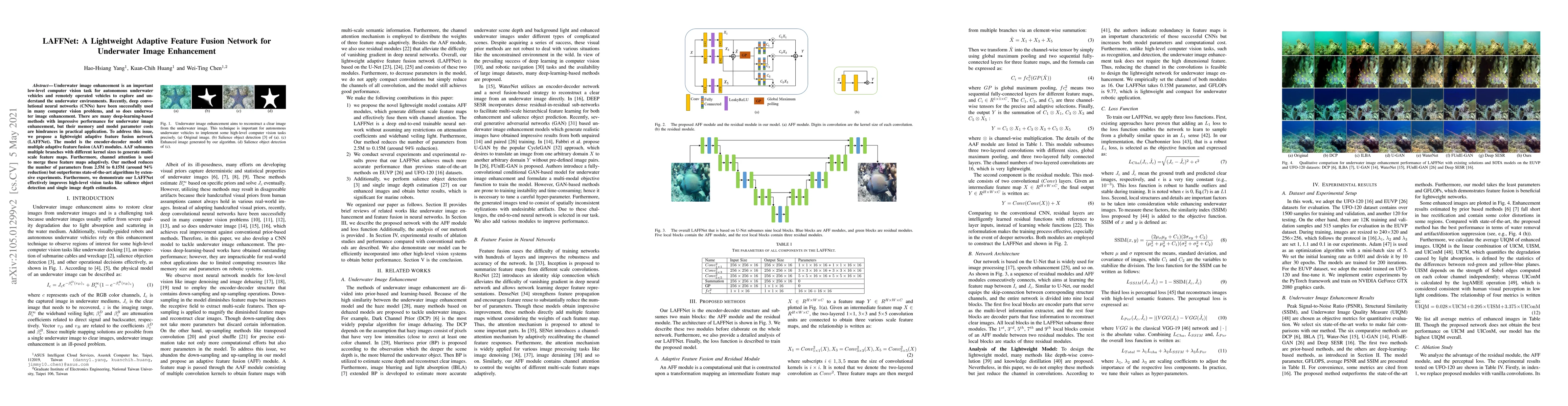 Underwater image enhancement is an important low-level computer vision task for autonomous underwater vehicles and remotely operated vehicles to explore and understand the underwater environments. Recently, deep convolutional neural networks (CNNs) have been successfully used in many computer vision problems, and so does underwater image enhancement. There are many deep-learning-based methods with impressive performance for underwater image enhancement, but their memory and model parameter costs are hindrances in practical application. To address this issue, we propose a lightweight adaptive feature fusion network (LAFFNet). The model is the encoder-decoder model with multiple adaptive feature fusion (AAF) modules. AAF subsumes multiple branches with different kernel sizes to generate multi-scale feature maps. Furthermore, channel attention is used to merge these feature maps adaptively. Our method reduces the number of parameters from 2.5M to 0.15M (around 94% reduction) but outperforms state-of-the-art algorithms by extensive experiments. Furthermore, we demonstrate our LAFFNet effectively improves high-level vision tasks like salience object detection and single image depth estimation.