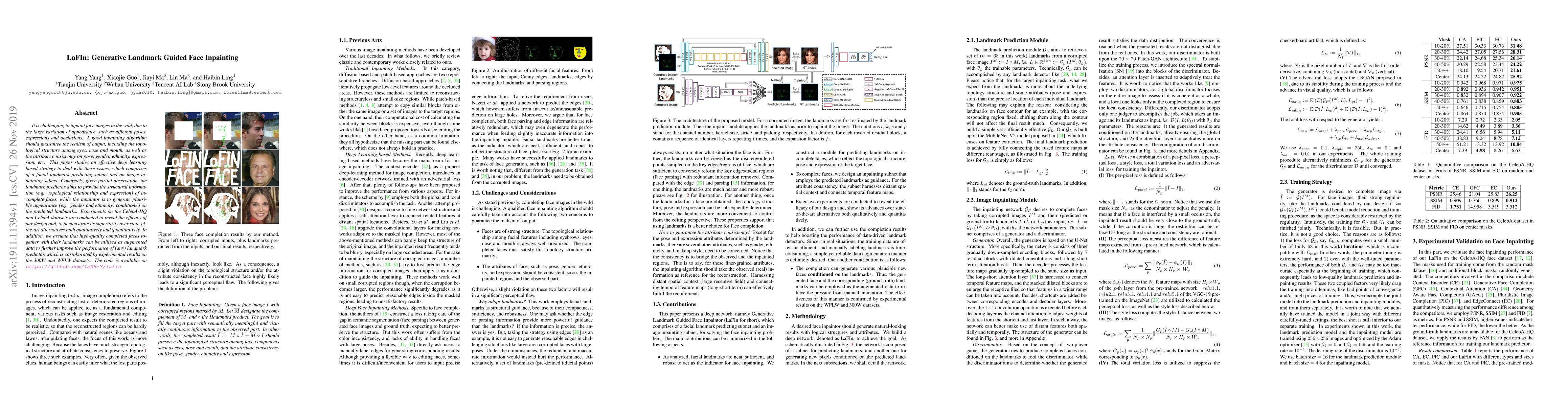 This paper proposes a deep learning method called LaFIn for face inpainting that uses a facial landmark predictor and an image inpainting subnet to generate realistic and consistent face completions, addressing challenges like pose, expression, and occlusion. Experiments show its effectiveness and superiority over other methods on various datasets.